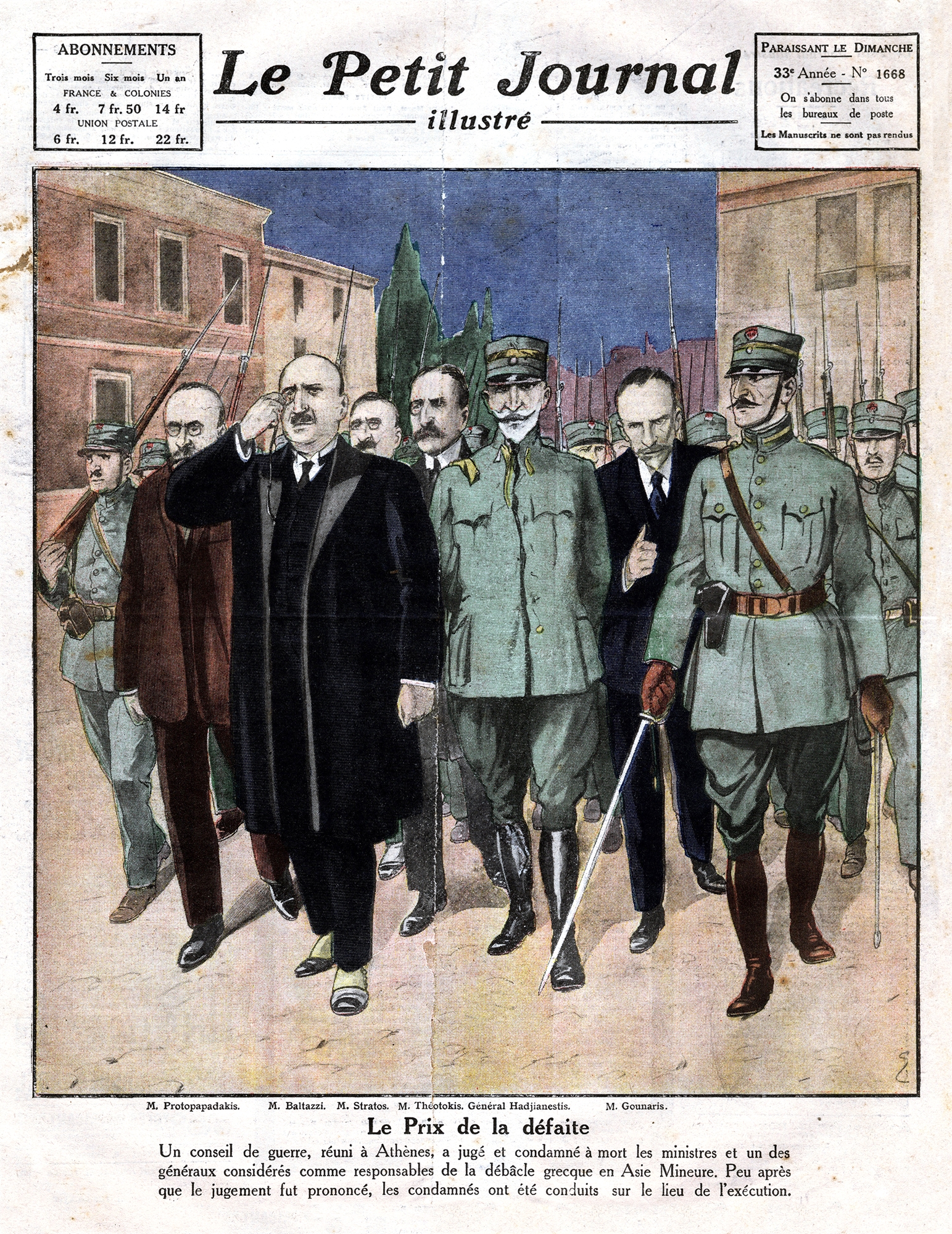 Άμεσα συγκροτήθηκε και η Ανακριτική Επιτροπή Ενόχων Εθνικής Καταστροφής, με αποστολή «την διακρίβωσιν των υπευθύνων της τελευταίας εθνικής συμφοράς, στρατιωτικών και μη, και την ταχίστην τιμωρίαν αυτών». ∆ύο εβδομάδες αργότερα εξέδωσε το πόρισμά της, παραπέμποντας στο στρατοδικείο τους ∆. Γούναρη, Π. Πρωτοπαπαδάκη, Γ. Μπαλτατζή, Ξ. Στρατηγό, Μ. Γούδα, Ν. Στράτο, Ν. Θεοτόκη και Γ. Χατζανέστη με την κατηγορία της «εσχάτης» προδοσίας, αφού «εκουσίως και εκ προθέσεως υπεστήριξαν την εισβολήν ξένων στρατευμάτων, ήτοι του τουρκικού εθνικιστικού στρατού, εις την επικράτειαν του Βασιλείου… παραδώσαντες άμα εις τον εχθρόν πόλεις, φρούρια, μέγα μέρος του στρατού και μεγίστης αξίας υλικόν πολέμου».