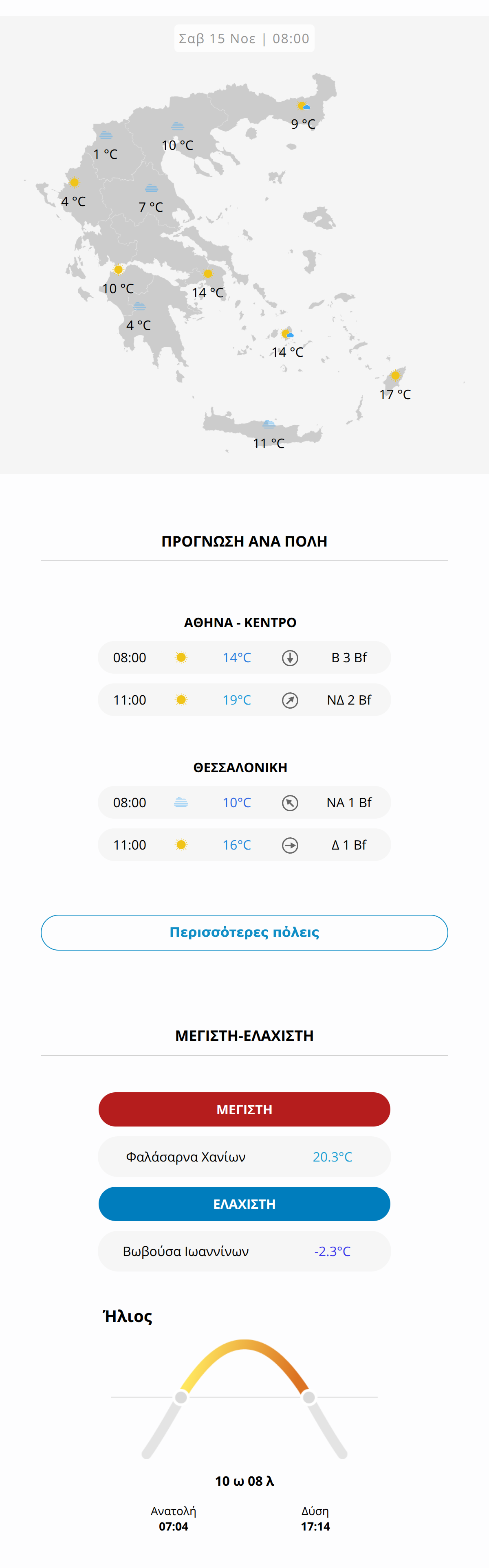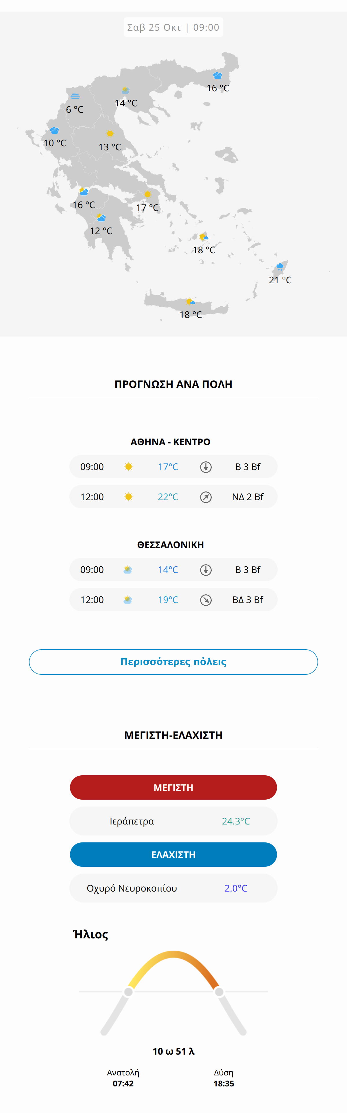 Πρόγνωση ανά πόλη. Μέγιστες-ελάχιστες θερμοκρασίες.