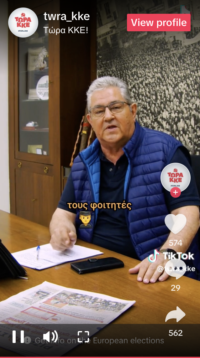 Τα social media δεν είναι ξένα για τον γραμματέα του ΚΚΕ. Τον είχαν ανακαλύψει εκείνα, αξιοποιώντας την αντιθεατρική εκφορά του λόγου του ως υλικό για μιμίδια –memes, στα ελληνικά– που αποδείχθηκαν πολύ δημοφιλή, μαλακώνοντας έτσι το στερεότυπο του άχαρου, δογματικού κομμουνιστή. Είναι άλλο όμως να έρχονται σε σένα οι μόδες κι άλλο να πηγαίνεις εσύ σε αυτές. Ο Δημήτρης Κουτσούμπας δοκιμάζει τώρα να μπει στο TikΤok, όχι ως μετα-μήνυμα, αλλά για να κάνει «κανονική» καμπάνια. Στο πρώτο του βίντεο μιλάει για την επιτυχία της Πανσπουδαστικής στις φοιτητικές εκλογές. Το να μιλάς για ΚΝΕ και φοιτητικές στο TikΤok είναι σαν να παίζεις μπουζούκι σε μάθημα πιλάτες. Σαν να στριμώχνεις έναν Κουτσούμπα μέσα σε puffer jacket, υποβάλλοντάς τον σε αυτο-υπονομευτική κασσελάκωση.