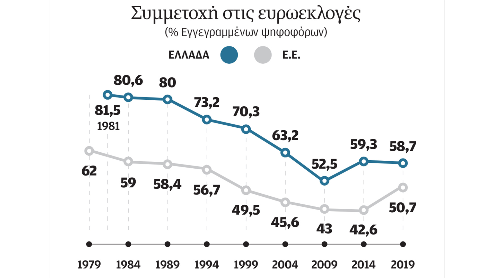 Στην Ελλάδα, τα αντίστοιχα στοιχεία του πίνακα είναι σαφές ότι παρακολουθούν εν γένει την τάση της συνολικής ευρωπαϊκής εικόνας. Από τα 80άρια συμμετοχής στις τρεις πρώτες ευρωεκλογές, η συνεχής πτωτική πορεία εντείνεται ιδιαίτερα μετά το 1994, καταλήγοντας όμως πτωτικά και το 2019 σε σχέση με το 2014. Στην Ελλάδα δηλαδή δεν καταγράφηκε αύξηση, αλλά μικρή μείωση του δείκτη συμμετοχής στις τελευταίες ευρωεκλογές, όπως άλλωστε συνέβη μεμονωμένα σε άλλες οκτώ από τις συνολικά 28 χώρες που μετείχαν το 2019 (ήταν η τελευταία φορά που συμμετείχε και η Μεγάλη Βρετανία). Προφανώς, όμως, θα πρέπει να επισημανθεί και η εξαίρεση του κατακόρυφα μικρού ποσοστού συμμετοχής (52,5%) που σημειώθηκε το 2009. Τα δύο αυτά δεδομένα αξίζουν έναν ευρύτερο σχολιασμό, αφού όμως διευκρινιστεί ότι οι εισαγωγικές ευρωεκλογές στην Ελλάδα γίνονται το 1981, συμπληρώνοντας το Ευρωκοινοβούλιο που σχηματίστηκε με εκλεγμένους αντιπροσώπους το 1979.