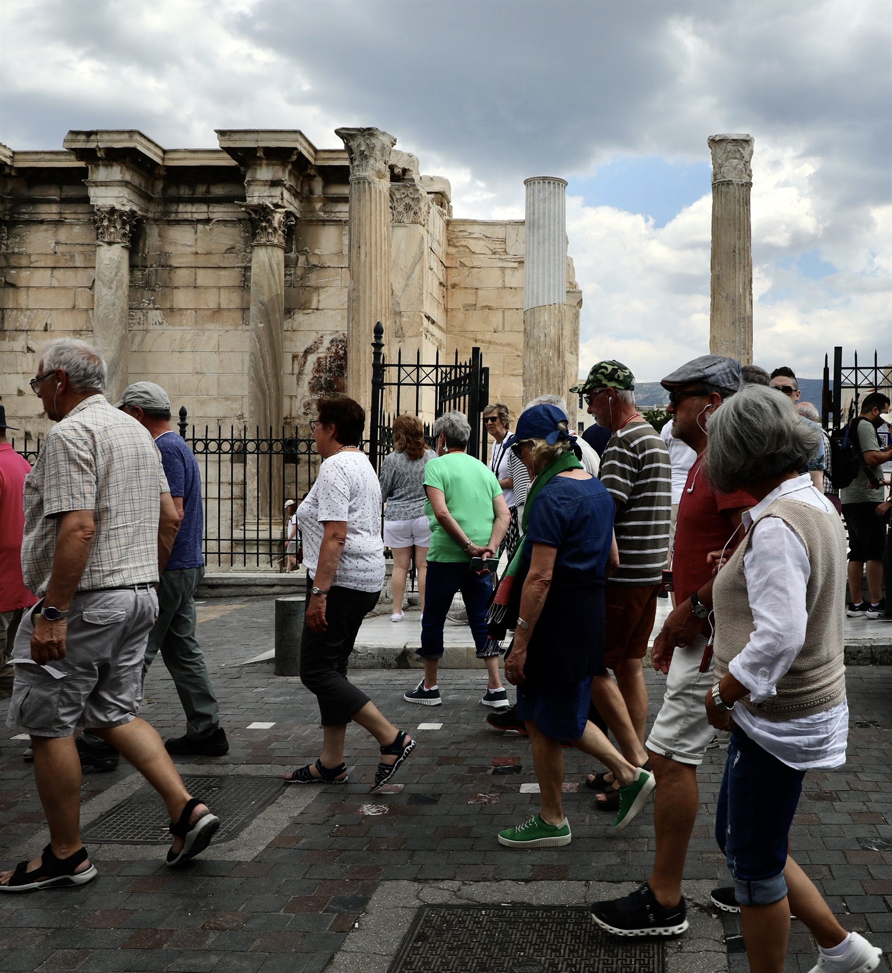 Είναι όμως ανακριβές. Πρόκειται για ένα σμήνος με γκρουπαρισμένα βλέμματα, που προσπαθούν να τα ακολουθήσουν τα ασυντόνιστα από τη ζέστη και τη σκόνη σώματα. Κοιτούν εξαντλημένα όπου δείχνει ο ξεναγός. Κοιτούν συλλογικά, κινούνται ομαδικά, γευματίζουν τακτοποιημένα. Οπου τους υποδείξουν, με εισηγήσεις και καθοδήγηση. Αποφεύγουν ό,τι θέλουν να διαφύγουν όσοι κάνουν τις υποδείξεις και αποδέχονται εισηγήσεις. Οριοθετημένα. Κι όλα αυτά τη δραστήρια εποχή της άπειρης πρόσβασης σε πληροφορίες. Ακολουθούν ένα σφιχτό χρονοδιάγραμμα περιήγησης ιστορικών μνημείων και τουριστικών πόλων που τους επισημαίνει και τους θυμίζει πού βρίσκονται. Βρίσκονται σίγουρα στην Αθήνα. Τι αντιλαμβάνονται, όμως, από μια πόλη που της γυρνούν την πλάτη;