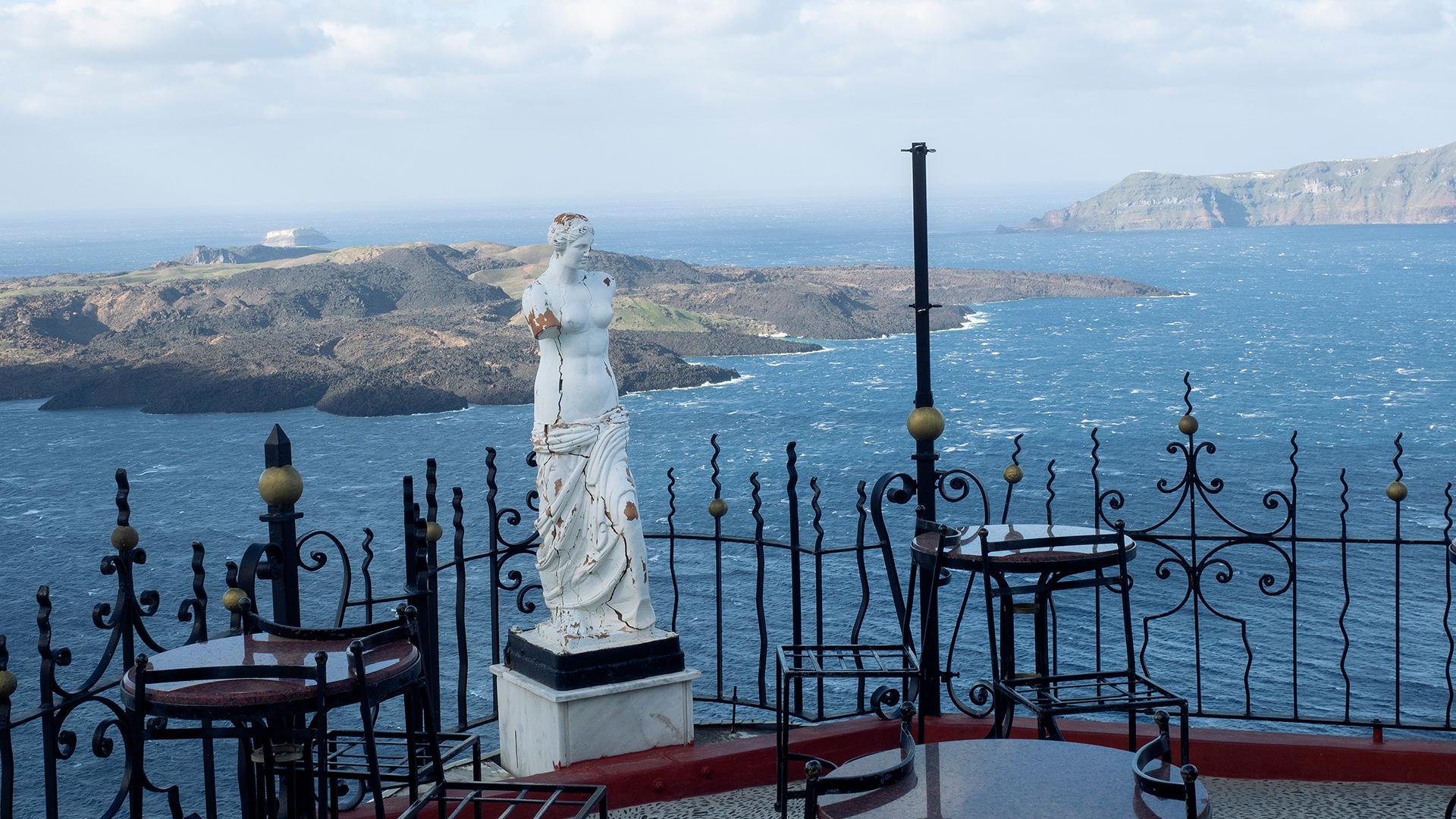 Η εικόνα που τράβηξε ο Enri Canaj για την «Καθημερινή» μεταφέρει αυτό το άρρητο μήνυμα. Ερημο καφέ στην καλντέρα. Καγκελάκι που θα το έλεγες σκεβρωμένο, αν δεν ήταν μέταλλο κακοχυμένο. Γυμνές μεταλλικές καρέκλες. Λες και ήθελε ο «ντιζάινερ» να εκδικηθεί με μια επίθεση ευτέλειας το εκθαμβωτικό τοπίο. Η μόνη «παρουσία» που διακόπτει την ερημία είναι στην άκρη του μπαλκονιού μια ημίγυμνη Αφροδίτη, ασάλευτη στη μέση του χαμού -σαν εργαζόμενο κορίτσι που το έχει ξεχάσει εκεί ο προαγωγός του κι εκείνο φοβήθηκε να αφήσει το πόστο του. Μια Αφροδίτη γύψινη, που την έχουν ραγίσει οι σεισμοί σε όλο της το φτηνό σώμα.