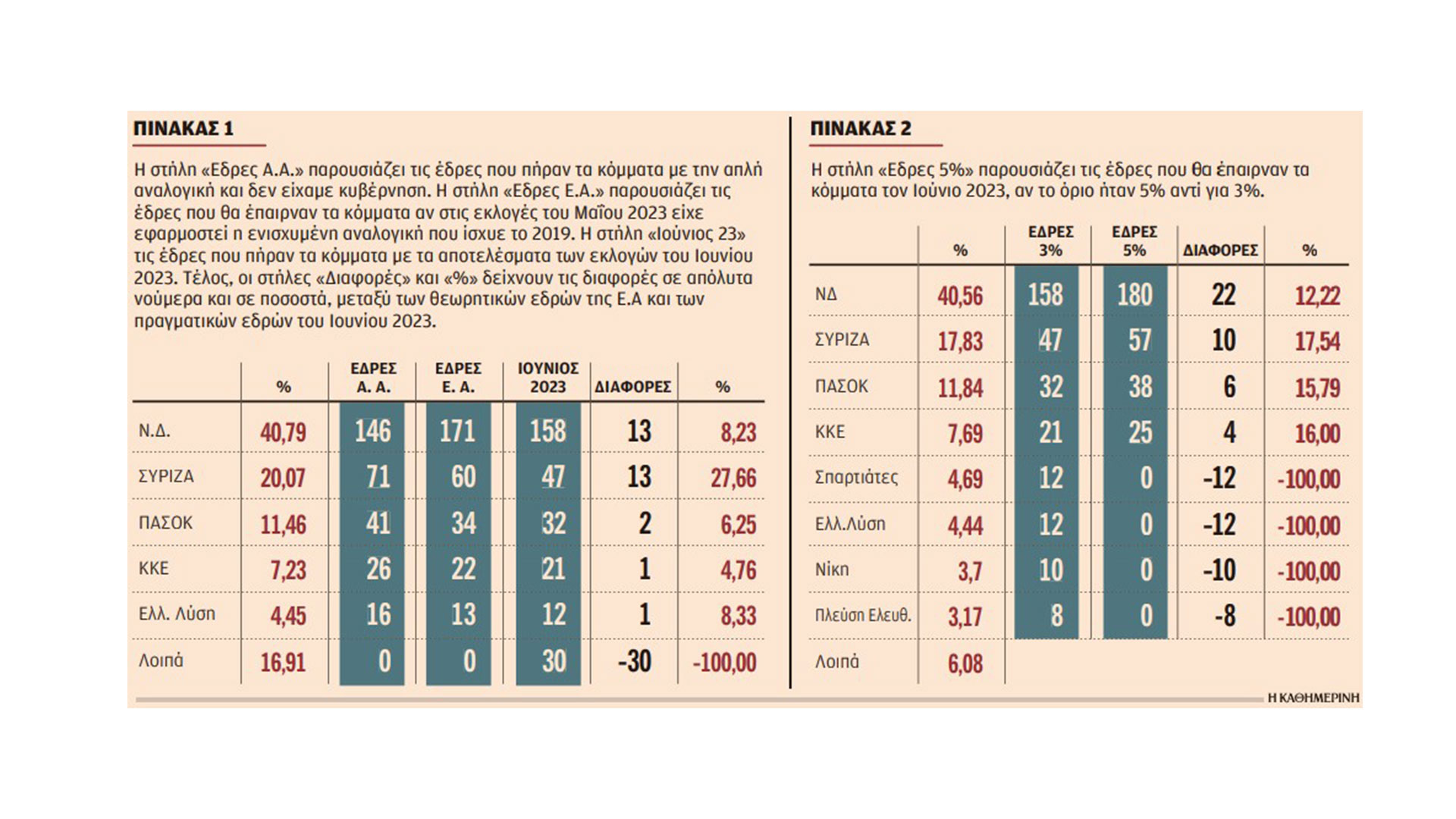 Παρακαλώ την προσοχή σας στον πίνακα 2. Εδώ, εκτός από τα αποτελέσματα των εκλογών του Ιουνίου 2023, όπως διαμορφώθηκαν, έχω προσθέσει τη στήλη «Εδρες 5%», στην οποία παρουσιάζονται οι έδρες που θα έπαιρναν τα κόμματα αν ίσχυε το κατώφλι του 5%. Οπως μπορείτε να διαπιστώσετε και τα 4 κόμματα θα ήταν ωφελημένα. Το αξιοσημείωτο είναι ότι ο πλέον ωφελημένος θα ήταν ο Σύριζα με 17,54% έδρες περισσότερες από όσες πήρε, ενώ η Ν.Δ. είναι η λιγότερο ωφελημένη γιατί θα έπαιρνε μόνο 12,22% έδρες παραπάνω.