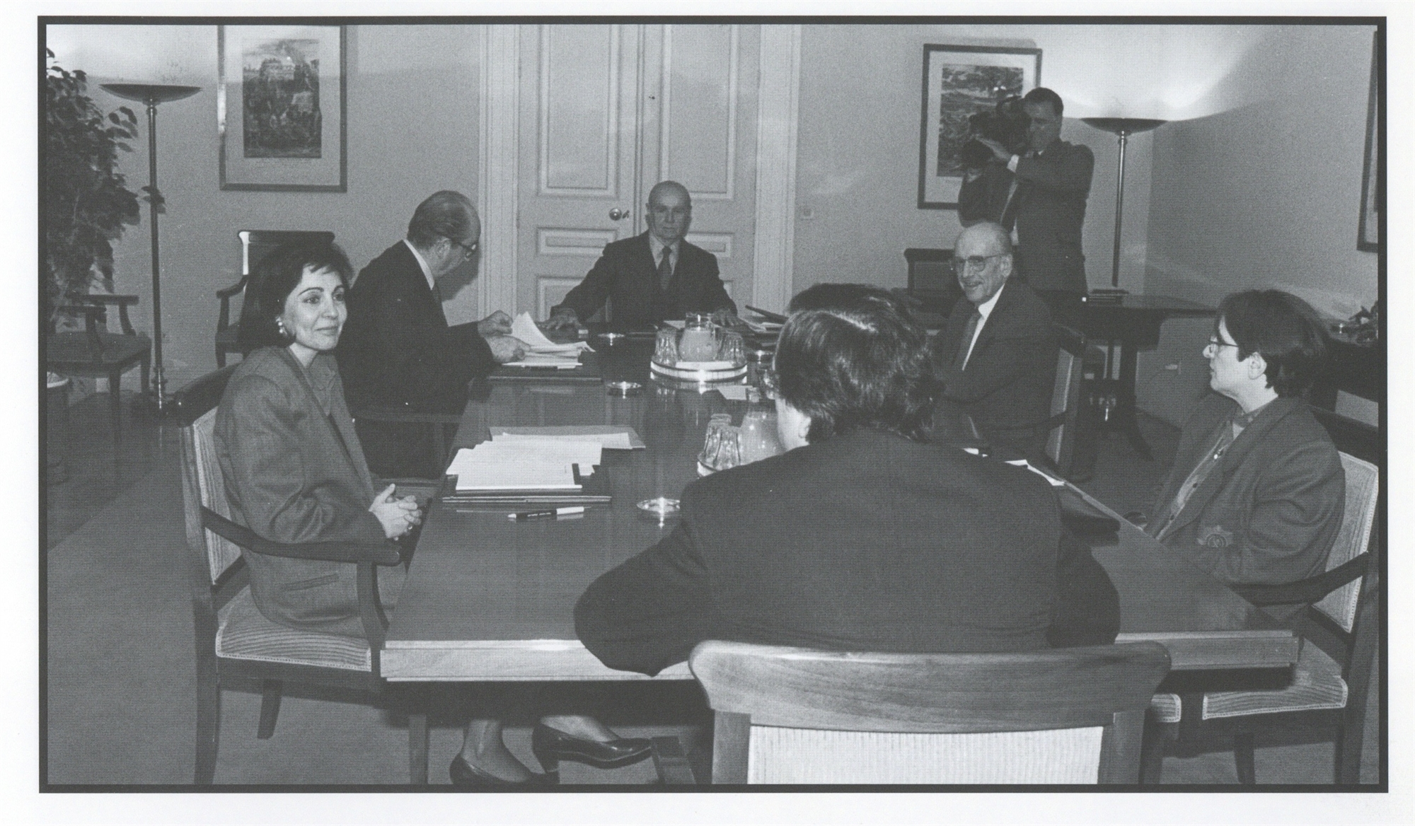 Τον Φεβρουάριο και κατόπιν τον Απρίλιο του 1992 συγκροτήθηκαν δύο συσκέψεις των πολιτικών αρχηγών υπό την αιγίδα του Προέδρου της Δημοκρατίας Κωνσταντίνου Καραμανλή. Αντικείμενο συζήτησης υπήρξε η στάση που έπρεπε να τηρήσει η Αθήνα έναντι της αξίωσης της κυβέρνησης των Σκοπίων να χρησιμοποιεί τον όρο «Δημοκρατία της Μακεδονίας» ως προσδιοριστικό του ονόματος του κράτους που μόλις είχε κηρύξει την ανεξαρτησία του από τη Γιουγκοσλαβία. Οι συσκέψεις κατέληξαν στη λήψη κατά πλειοψηφία απόφασης (με διιστάμενη τη θέση του ΚΚΕ) βάσει της οποίας η Ελλάδα ουδέποτε θα αναγνώριζε την ύπαρξη κράτους στο όνομα του οποίου θα υπήρχε η λέξη Μακεδονία. Αν και αντικατόπτριζε ευρύτατη κομματική (αλλά και κοινωνική) συναίνεση, η απόφαση περισσότερο εγκλώβισε την Αθήνα σε μια άκαμπτη στάση παρά τη διευκόλυνε να προβεί σε διαπραγματευτικούς ελιγμούς που θα επέτρεπαν τη διευθέτηση του προβλήματος με όσο το δυνατόν ευνοϊκότερο τρόπο για την ελληνική πλευρά. Ο τότε πρωθυπουργός Κωνσταντίνος Μητσοτάκης είχε ευθύς εξαρχής διατυπώσει αυτόν τον προβληματισμό. Ομως παρέμεινε εξαρτημένος από την τυπικά μη δεσμευτική απόφαση των πολιτικών αρχηγών, η ανατροπή της οποίας όμως συνεπαγόταν δυσβάστακτο πολιτικό κόστος. Ο Ανδρέας Παπανδρέου, ο οποίος ως αρχηγός της αξιωματικής αντιπολίτευσης είχε εν πολλοίς προσπαθήσει να στριμώξει την κυβέρνηση Μητσοτάκη στο «Μακεδονικό», βρέθηκε δέσμιος του δικού του στρατηγήματος όταν ανέλαβε την εξουσία το φθινόπωρο του 1993.