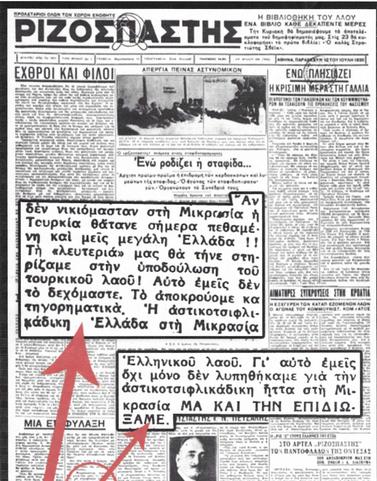 Θέλω να σας πάω ακόμα πιο πίσω στον χρόνο, για να διαπιστώσετε ότι οι κομμουνιστές ήταν πάντοτε πιστοί μόνο στον κομμουνισμό. Στο πρωτοσέλιδο του «Ριζοσπάστη» με ημερομηνία «Παρασκευή 10 Ιούλη 1936» σε ένα άρθρο που τιτλοφορείται «Μια επιφύλαξη», διαβάζω μεταξύ άλλων: Αν δεν νικιόμασταν στη Μικρασία η Τουρκία θάτανε σήμερα πεθαμένη και μεις μεγάλη Ελλάδα!! Τη «λευτεριά» μας θα τήνε στηρίζαμε στην υποδούλωση του τουρκικού λαού! Αυτό εμείς δεν το δεχόμαστε […] Γι’ αυτό εμείς όχι μόνο δεν λυπηθήκαμε για την αστικοτσιφλικάδικη ήττα στη Μικρασία ΜΑ ΚΑΙ ΤΗΝ ΕΠΙΔΙΩΞΑΜΕ. [..] (σημ. τα κεφαλαία είναι στο κείμενο).