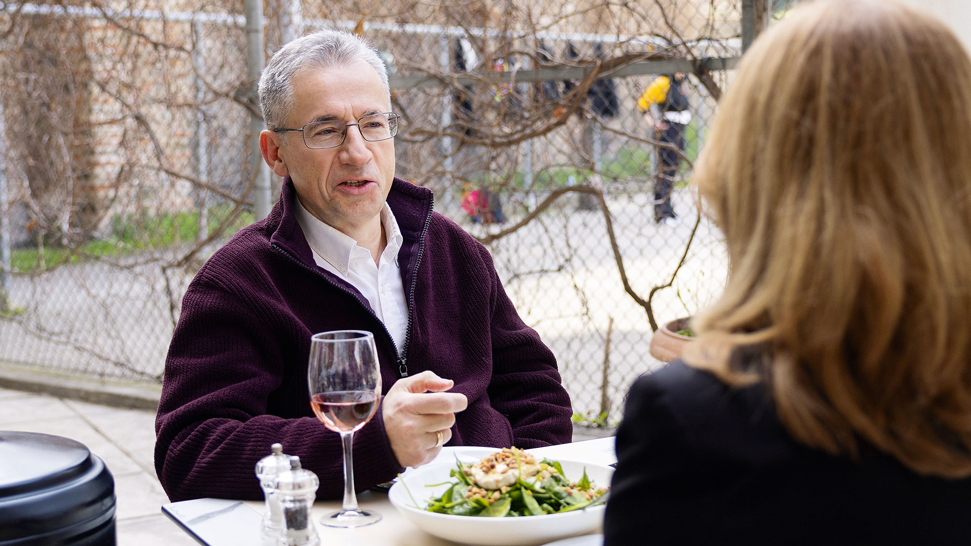Το «Σέμπρικο» που επέλεξε ο Ισίδωρος Ζουργός για το γεύμα βρίσκεται δίπλα σ’ ένα από τα σωζόμενα απομεινάρια του βυζαντινού τείχους. Καθώς μοιραζόμασταν –τιμώντας την έναρξη της Σαρακοστής– μπάλες μπακαλιάρου, χταπόδι σχάρας, μια βελούδινη φάβα με καραμελωμένα κρεμμύδια, πίνοντας ροζέ Τυρνάβου Κτήματος Μίγα (το σύνολο 59,50 ευρώ), μου εξηγούσε τον λόγο για τον οποίο δεν έχει τελειώσει συγγραφικά με τη Θεσσαλονίκη. «Μέσα στην πόλη όπου μεγάλωσα, υπάρχουν πολλές άλλες αόρατες πόλεις, υπόγειες και επίγειες. Αρκεί να ρίξεις μια ματιά σ’ αυτά τα τείχη, στα αρχαιολογικά ευρήματα, σε φωτογραφίες των αρχών του περασμένου αιώνα. Οι μεταμορφώσεις της είναι θεαματικές. Τις κρυμμένες αυτές πόλεις επιχειρώ να ανιχνεύσω και στα μυθιστορήματά μου, με μια ενδόμυχη φιλοδοξία, το τοπικό να γίνει παγκόσμιο».