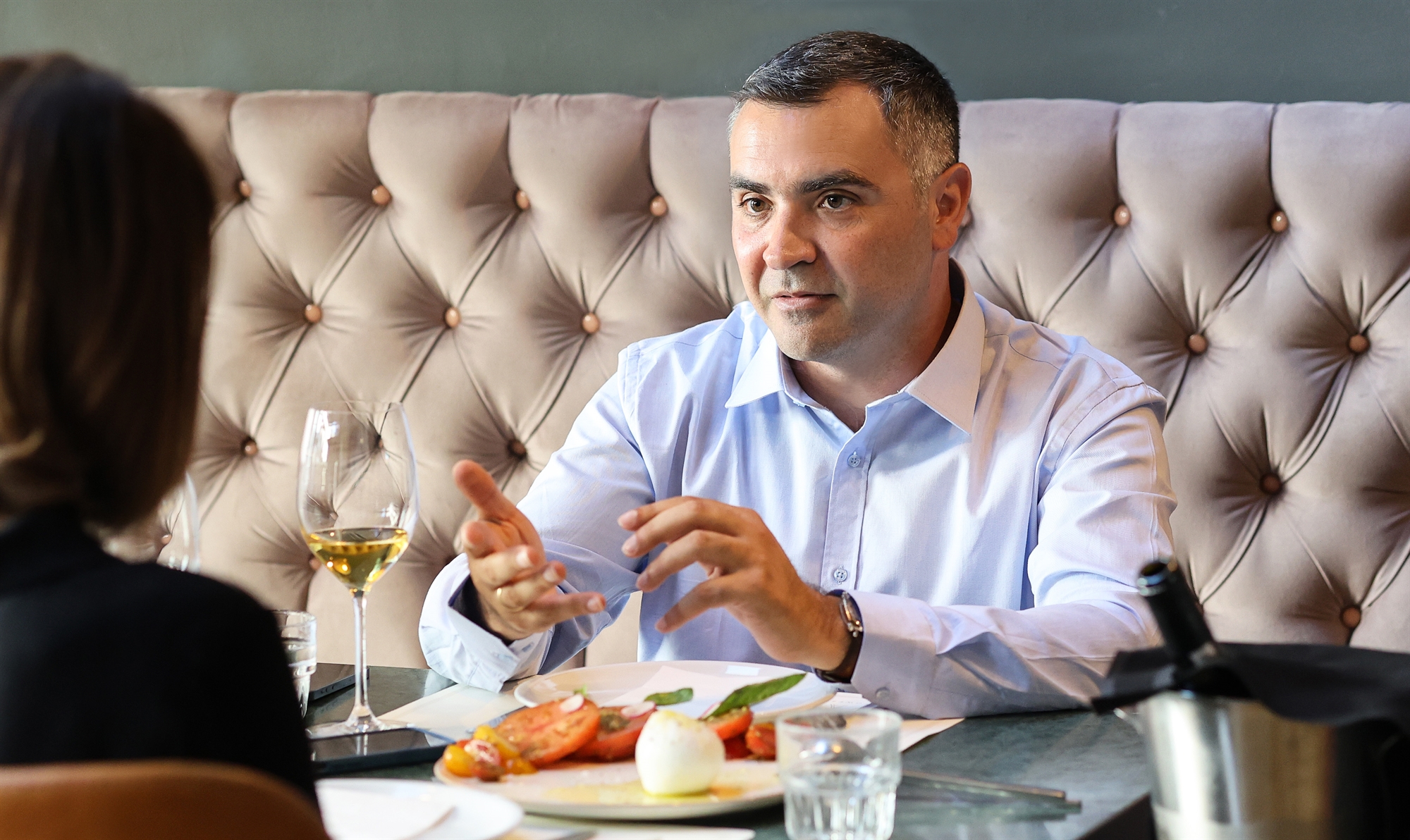 Βρεθήκαμε ένα ζεστό απόγευμα στο εστιατόριο Novak, δίπλα από τον Πύργο Αθηνών, και προτιμήσαμε να καθίσουμε στον κλιματιζόμενο εσωτερικό χώρο. Μου είχε πει εξαρχής πως όσο και αν ακούγεται περίεργο δεν τρώει φέτα και ελιές. Παραγγείλαμε μια σαλάτα με τοματίνια και πέστο, σεβίτσε λαβράκι για ορεκτικό, ενώ για κύρια πιάτα επιλέξαμε σολομό και τόνο. Το κρασί το έφερε ο ίδιος. Είναι ένα σαντορινιό λευκό, το οποίο προμηθεύεται κάθε καλοκαίρι που έρχεται στην Ελλάδα και επιστρέφει πάντα με αυτό στις αποσκευές του στο Ηνωμένο Βασίλειο. Ο λογαριασμός ήταν 75 ευρώ.