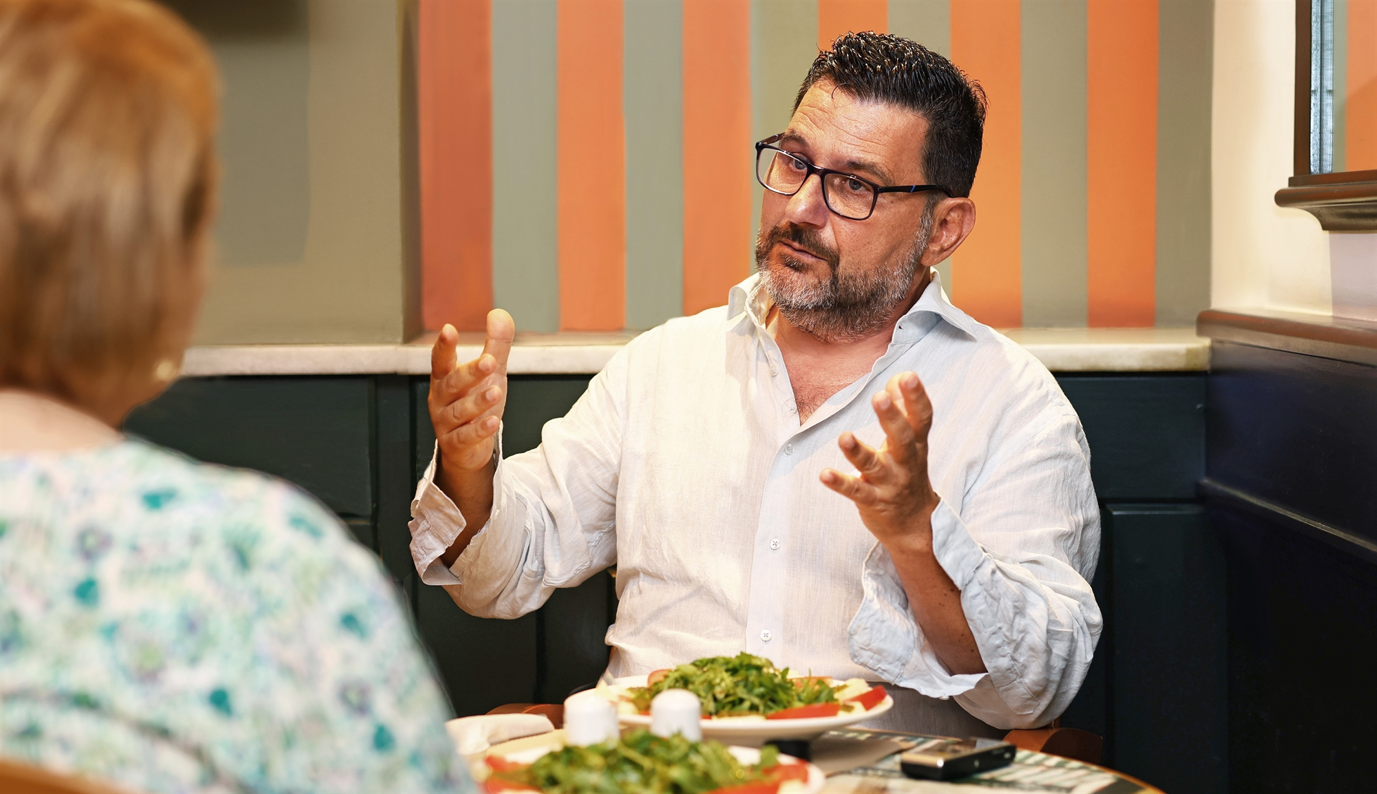 Επέλεξε το «Φίλιον», που αγάπησε ως «Dolce» στα φοιτητικά του χρόνια, στην οδό Σόλωνος. Στον καύσωνα αντέξαμε από μια σαλάτα –ντομάτα, μοτσαρέλα, πέστο– ο καθένας, ξινό νερό Φλώρινας και εσπρέσο στο τέλος. «Θα πληρώσω λόγω εντοπιότητας», ήταν αμετάπειστος για τον λογαριασμό. Θυμήθηκε τις πρώτες ανασκαφές στην Επίδαυρο, στη Νάξο, στο Ρούτσι, στο Ακρωτήρι, στη Β. Γαλλία (Αράς) όταν με έναν υπνόσακο μάθαινε τον κόσμο, τη γνωριμία του με την πολυσχιδή Ντιαμάντα Γκαλάς στο Πρίνστον, με την οποία δέθηκε με φιλία. «Το γεγονός ότι στα χρόνια της Αμερικής γνώρισα την Ντιαμάντα (κανείς δεν θα ξεχάσει τη φωνή της να επιβάλλεται στην άδεια χειμωνιάτικη Οία, όταν ήλθε στη Σαντορίνη), τον Στήβεν Αντωνάκο, τον Εντμουντ Κίλι, νομίζω απηχεί τον πλούτο που κερδίζει κανείς όταν από “αλήτης” στο Μαρόκο γίνεται εταίρος μιας ακαδημαϊκής ελίτ».