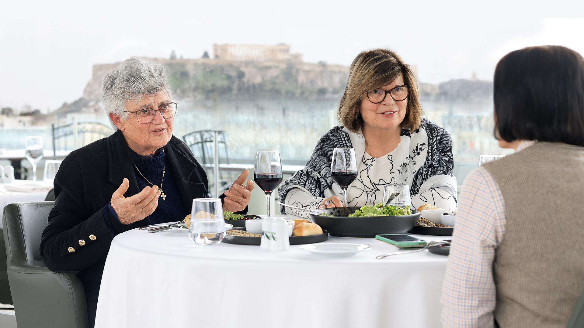 Γευματίσαμε στο Olive Garden του «Τιτάνια». Ξεκινήσαμε με πράσινη σαλάτα και συνεχίσαμε με ψητό λαβράκι και σκιουφιχτά Κρήτης, που συνοδεύσαμε με ένα ποτήρι κρασί. «Λένε, μα 50 χρόνια δεν βαρεθήκατε να λέτε τα ίδια; Ξεχάστε το. Ομως, το τραύμα είναι εκεί, η σκλαβιά είναι εκεί – δεν αναπνέουμε», λέει η κ. Περικλέους – Παπαδοπούλου. «Στην Αγία Τριάδα έχουν μείνει 50 άτομα, στο Ριζοκάρπασο 300, από τα οποία 15 παιδιά. Με πρωτοβουλία του Νίκου Λυγερού λειτούργησε και πάλι το Γυμνάσιο Ριζοκαρπάσου και λίγες οικογένειες επέστρεψαν. Ομως, η ζωή εκεί έχει σταματήσει στο ’74». «Πρέπει», λέει η κ. Φωκά, «να προβληματιστούν οι ηγέτες στην Κύπρο και στην Ελλάδα, εκείνοι που ορίζουν τις τύχες μας και να ανακόψουν αυτή την καταστροφή». «Είναι δυνατόν στον 21ο αιώνα της εξέλιξης, του πολιτισμού, των ανθρωπίνων δικαιωμάτων, να διαπράττεται αυτή η αδικία, να εγκαταλείπεται ένας ολιγάριθμος αδύναμος λαός στα χέρια του δυνάστη; Δεν θέλουμε πόλεμο, μόνο δικαιοσύνη και ελευθερία».