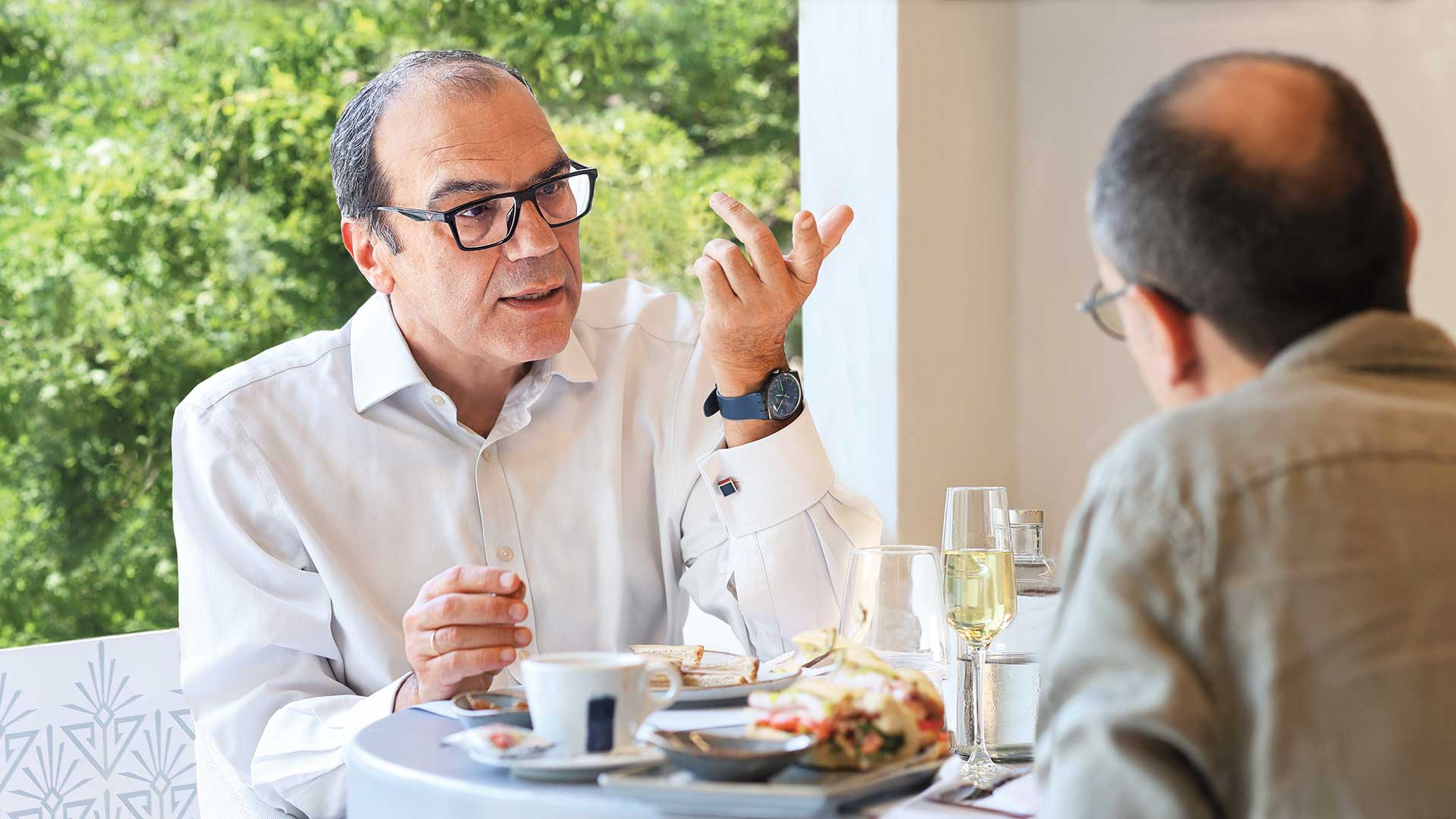 Επέλεξε το La Divina, το καφέ του Μουσείου Μαρία Κάλλας (Μητροπόλεως 44) και παρότι έφτασα λίγο νωρίτερα από την ώρα του ραντεβού, εκείνος ήταν ήδη εκεί, αναζητώντας στο μουσείο μια πινακίδα στην οποία αναγράφεται ένα δικό του σχόλιο για τη μεγάλη σοπράνο. Ηταν νωρίς το μεσημέρι, επομένως αρκεστήκαμε, ο μεν συνεντευξιαστής σε μια μπαγκέτα με καπνιστό χοιρινό και έναν διπλό εσπρέσο, ο δε συνεντευξιαζόμενος σε ένα τοστ ολικής με γαλοπούλα και έναν αφρώδη οίνο Piccini. Ισως έμεινα περισσότερο ευχαριστημένος με την επιλογή μου από ό,τι εκείνος με τη δική του. Πληρώσαμε 21,4 ευρώ, ευχαριστήσαμε τους υπευθύνους για την άψογη εξυπηρέτηση και βγήκαμε στη βουή και τη λάβρα μιας καλοκαιρινής και όχι πάντα μυθιστορηματικής Αθήνας.