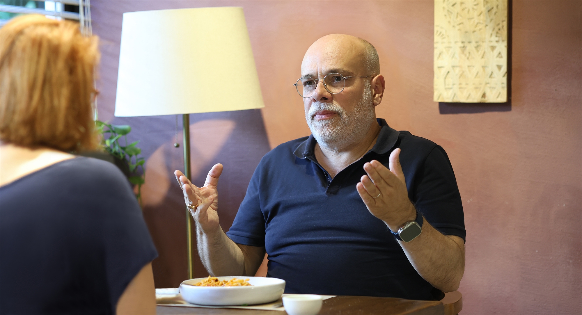 Βρεθήκαμε στο εστιατόριο «Aperio» στον Χολαργό μεσημέρι, ακριβώς την ώρα που ανοίγει, και έτσι μπορέσαμε να βρούμε τραπέζι σε σημείο χωρίς πολλή ζέστη αλλά και χωρίς έντονο αιρκοντίσιον. Εκείνος μόλις είχε φθάσει από την Πάτρα, όπου είναι η μόνιμη κατοικία του, αλλά θα παρέμενε στην Αθήνα για να δει τον γιο του που σπουδάζει.