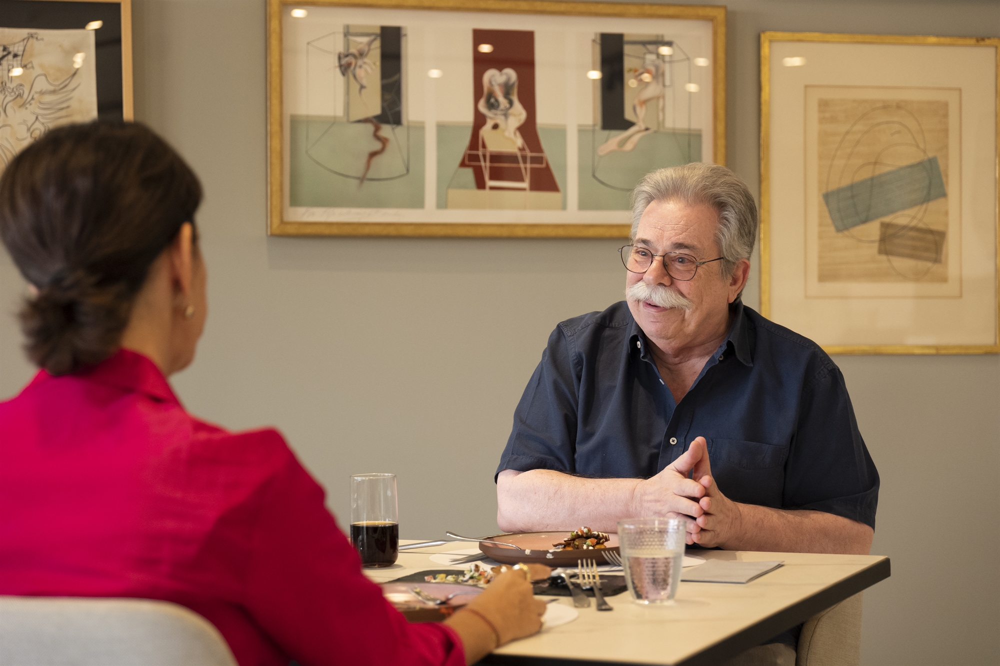 «Αυτό το γεύμα θα έκανε έξω φρενών τον γιατρό μου», λέει σαν να κάνει μια ωραία σκανταλιά. Το εστιατόριο του Μουσείου Μπενάκη στο Κολωνάκι βρίσκεται κοντά στο σπίτι του, χώρος οικείος. Για πρώτο πιάτο μοιραστήκαμε χειροποίητο χοιρινό γύρο. Ως κύριο παρήγγειλε ένα μπέργκερ με πατάτες κι εγώ ψητό φιλέτο κοτόπουλο. Δεν πίνει αλκοόλ, ούτε καφέ. Ετσι, πήραμε ένα μπουκάλι νερό και δύο αναψυκτικά – εγώ στη light εκδοχή του, εκείνος την κανονική. Για επιδόρπιο επέλεξε ένα προφιτερόλ. Το σύνολο ήταν 77,60 ευρώ.