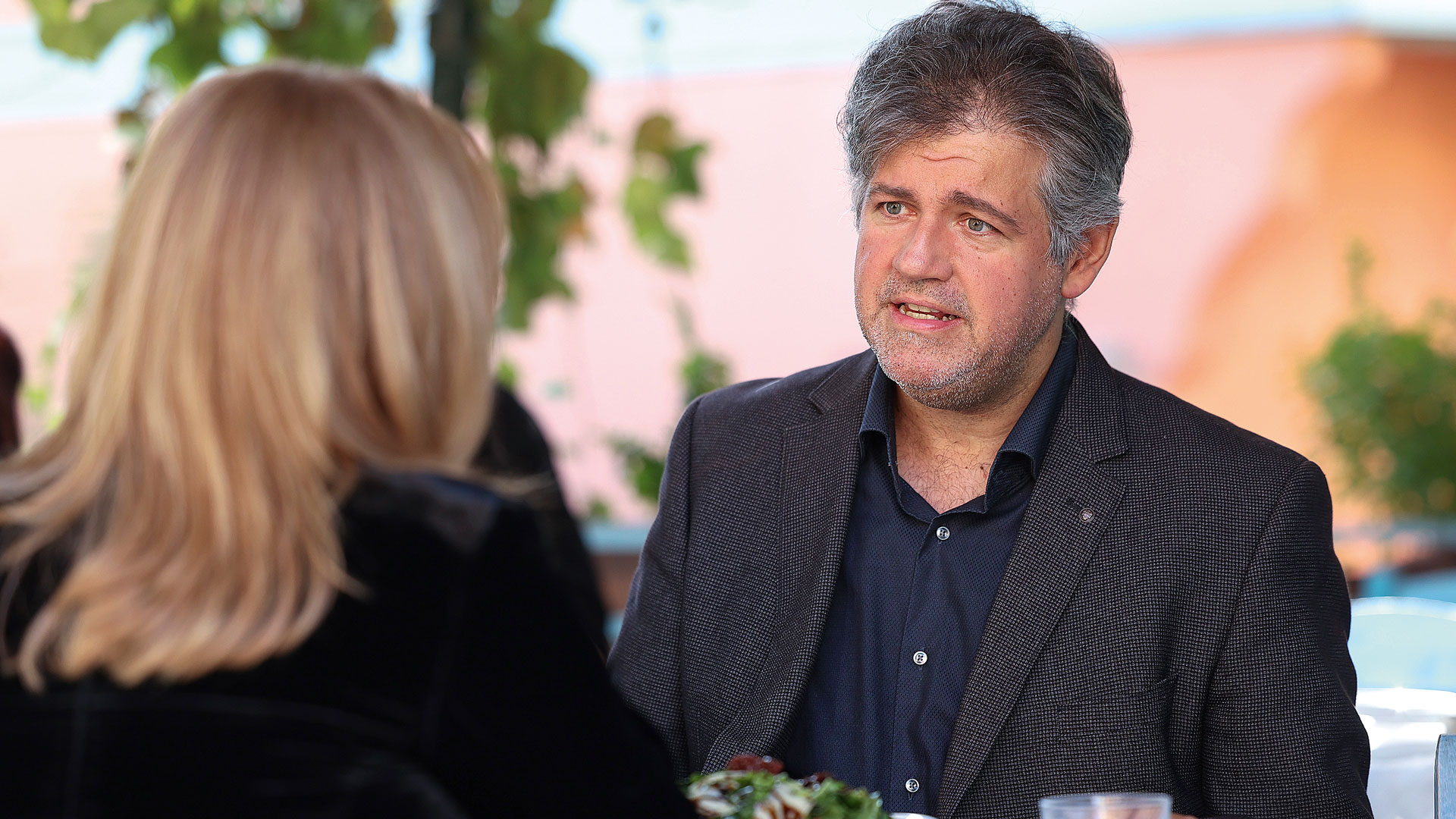 Στο καφέ ουζερί «Τσινάρι», μοιραστήκαμε μια ποικιλία από μεζέδες, πίνοντας από ένα ποτήρι ούζο. Αναφέρθηκε στους αγαπημένους του συνθέτες: «Ο Βιβάλντι με συγκινεί για την απόλυτα λιτή του γραφή, τόσο απλή αλλά τόσο ιδιοφυής, ο Γιόζεφ Χάιντν κυρίως για την εφευρετικότητα και το χιούμορ». Και στις δικές του συνθέσεις: «Εγραφα από παιδί, αλλά όταν μπήκα στον ακαδημαϊκό κόσμο αποτραβήχτηκα. Ντρεπόμουν να παρουσιάσω έργο μου. Το τόλμησα γύρω στα 20. Πέρασε βέβαια μια δεκαετία για να προσθέσω στο βιογραφικό μου τη λέξη συνθέτης». Μου μίλησε για τα παιδιά του που σπουδάζουν μουσική στη Βιέννη, η συζήτηση στράφηκε στα ελληνόπουλα. «Το μεγάλο στοίχημα είναι οι 25άρηδες. Κουβαλούν θλιβερές μνήμες από την οικονομική κρίση, γι’ αυτό δύσκολα γυρίζουν πίσω. Η προσπάθειά μας είναι να τους κερδίσουμε».