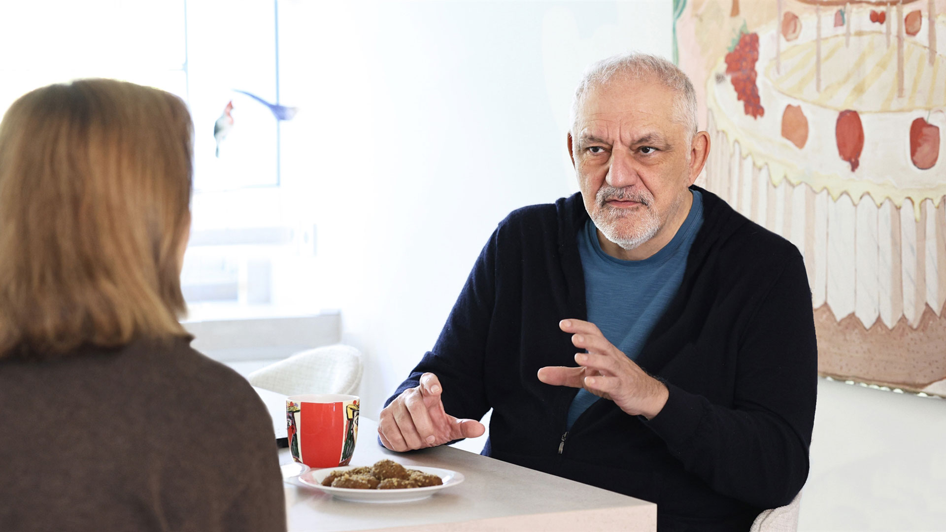 «Ελα για καφέ στο σπίτι, θα είναι πιο ήσυχα», πρότεινε. Ο καφές έγινε τσάι και από το σαλόνι τελικά προτιμήσαμε την άρτι ανακαινισμένη κουζίνα, την οποία κοσμεί ένας υπέροχος πίνακας του ζωγράφου Μανώλη Ζαχαριουδάκη. Σχολιάζω τη γενναιοδωρία που δείχνει απέναντι στους νέους καλλιτέχνες ο Νίκος Πορτοκάλογλου. Τους εμπιστεύεται και τους αναδεικνύει – και στη δισκογραφία, και στα λάιβ. «Το κάνω για ιδιοτελείς λόγους. Μαθαίνω καινούργια κόλπα από τη νεολαία», λέει γελώντας.
