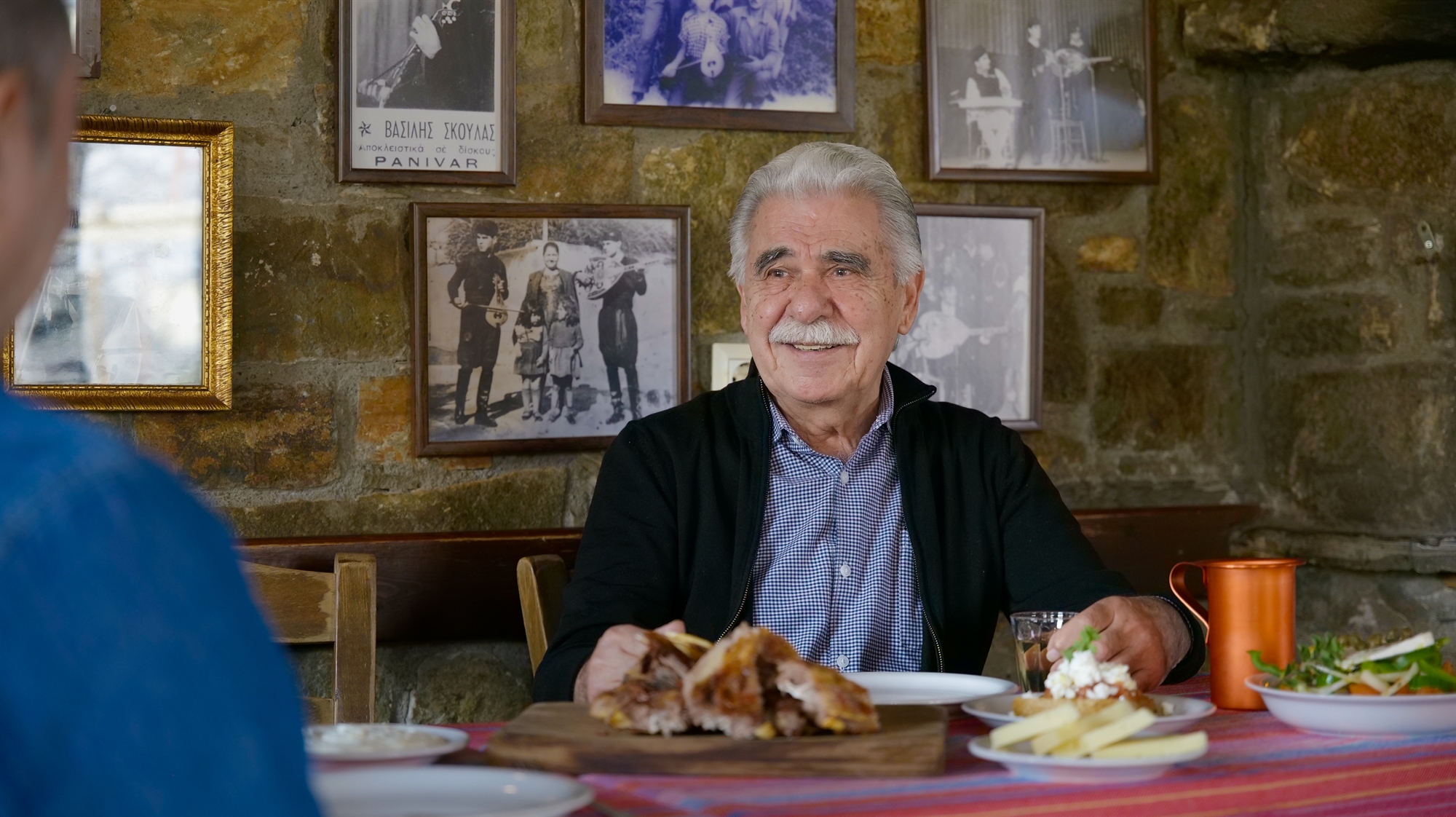 Συμφάγαμε στο εστιατόριο – καφέ της «Ντελίνας», του πολυχώρου πολιτισμού και αναψυχής που ο Σκουλάς έχει δημιουργήσει στον τόπο του, τα Ανώγεια. Για ορεκτικό δοκιμάσαμε παπούλες με λάδι και ξίδι. Τις μάζεψε εκείνη τη στιγμή η Ελένη Τορνεσάκη, τις επιμελήθηκε ο Βαγγέλης Σκουλάς (συνεργάτις και εξάδελφός του, αντίστοιχα). Στη συνέχεια κατέφθασαν στο τραπέζι μας, ντάκος, ανθόγαλο, γραβιέρα ωριμασμένη και χωριάτικη σαλάτα. Ακολούθησαν μακαρόνια με μυζήθρα, πατάτες τηγανητές κυδωνάτες και αντικριστό. Τα συνοδεύσαμε με Βιδιανό του οινοποιείου Κλάδος. Ο Σκουλάς προτιμά χαμηλά ποτήρια και μετάγγιση του κρασιού σε καρτούτσο. Για επιδόρπιο, γιαούρτι με μέλι, ρακί και μαλοτήρα εμπλουτισμένη με άλλα βότανα (φασκόμηλο, δεντρολίβανο, μέντα). Ολα κερασμένα από τον οικοδεσπότη.