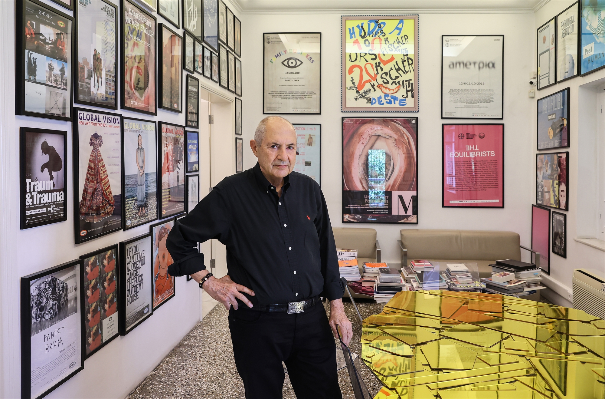 Συναντηθήκαμε στα γραφεία του Ιδρύματος ΔΕΣΤΕ στη Νέα Ιωνία. Βρίσκονται στην προσφυγική γειτονιά των κλωστοϋφαντουργείων –εδώ στεγαζόταν μια καλτσοβιοτεχνία–, και η σιδερένια αυλόπορτα έχει συντηρηθεί αλλά δεν έχει αλλάξει. Οποιος είδε το mega yacht «Guilty» του Κύπριου επιχειρηματία, συλλέκτη και ιδρυτή του ΔΕΣΤΕ δεμένο στο λιμάνι της Υδρας –115 πόδια μήκος, ποπ εξωτερικό με γεωμετρικά σχέδια, κίτρινους ρόμβους, ροζ τρίγωνα και μπλε πολύγωνα–, άλλο περιμένει να συναντήσει. Οφθαλμαπάτη. Μπαίνοντας, η απλότητα του εξωτερικού κτιρίου δίνει τη θέση της σε μια έκρηξη χρωμάτων και σχημάτων με την ορμή ζωντανού οργανισμού. Ο Δάκης Ιωάννου έχει στο γραφείο του έργα σπουδαίων καλλιτεχνών της σύγχρονης τέχνης με αφιερώσεις, έχει χιουμοριστικά πορτρέτα του, έχει memorabilia από σημαντικές συνεργασίες, αλλά στην πόρτα είναι κολλημένη μια ζωγραφιά του εγγονού του. Γράφει «Dakis», με πολύχρωμα γράμματα.