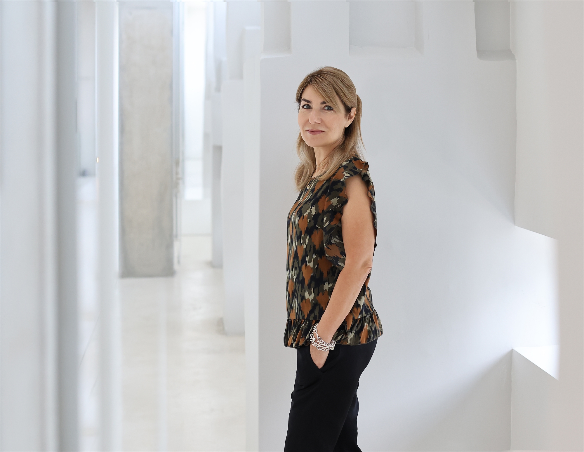 Για να κάνουμε αυτή τη συνέντευξη καθόμαστε η μία απέναντι στην άλλη, στο μεγάλο τραπέζι της αίθουσας των συσκέψεων που επικοινωνεί με το προσωπικό της γραφείο. Κάποιες φορές υπογραμμίζει τα λεγόμενά της χτυπώντας το χέρι στο τραπέζι. Οι φωτογραφίες της είναι γελαστές και θερμές, κι έτσι είναι και η ίδια όταν δεν μιλάει επισήμως.