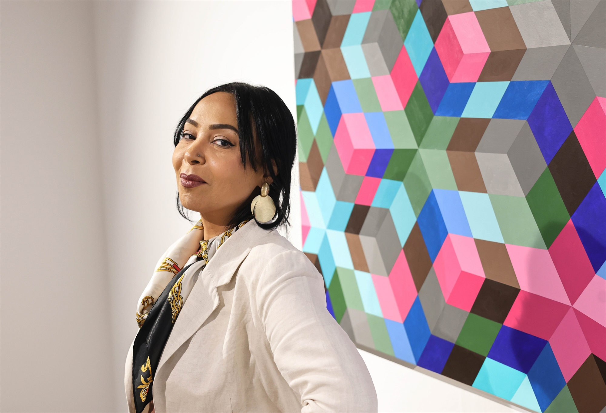«Ως μαθηματικός που είμαι, με την αφηρημένη ζωγραφική θέλω πάντοτε να λύσω ένα πρόβλημα. Η τέχνη μου είναι μια εξίσωση, μια αναζήτηση ισορροπίας ανάμεσα στη λογική και στο συναίσθημα». Η Εμπντιζάμ Αμπντουλαζίζ, με την οποία συζητάμε, έχει έρθει στην Ελλάδα για τα εγκαίνια της ομαδικής έκθεσης του Ιδρύματος Εικαστικών Τεχνών και Μουσικής Β. & Μ. Θεοχαράκη που είναι αφιερωμένη σε έξι πρωτοποριακές γυναικείες φωνές της γεωμετρικής αφαίρεσης: Οπυ Ζούνη, Ετέλ Αντνάν, Σάμια Χαλάμπι, Σαλούα Ραούντα Σουκέρ, Λούμπνα Τσάουνταρι και την ίδια. Η ομάδα των έξι καλλιτέχνιδων που παρουσιάζονται στην Αθήνα έχει πολλά κοινά στοιχεία, μολονότι κάποιες δεν βρίσκονται πλέον στη ζωή ή είναι πολύ ηλικιωμένες. Γεννημένες στο Κάιρο, στη Βηρυτό, στην Τανζανία από Πακιστανούς γονείς ή στη Σάρτζα, όπως η Αμπντουλαζίζ, εγκατεστημένες στο Παρίσι ή στις Ηνωμένες Πολιτείες, μιλούν όλες μια γλώσσα που λειτουργεί ταυτόχρονα ως πράξη αντίστασης και ποιητική διατύπωση, διατηρώντας παράλληλα την αυστηρή –«ανδρική» θα έλεγαν στο παρελθόν– σύνθεση.