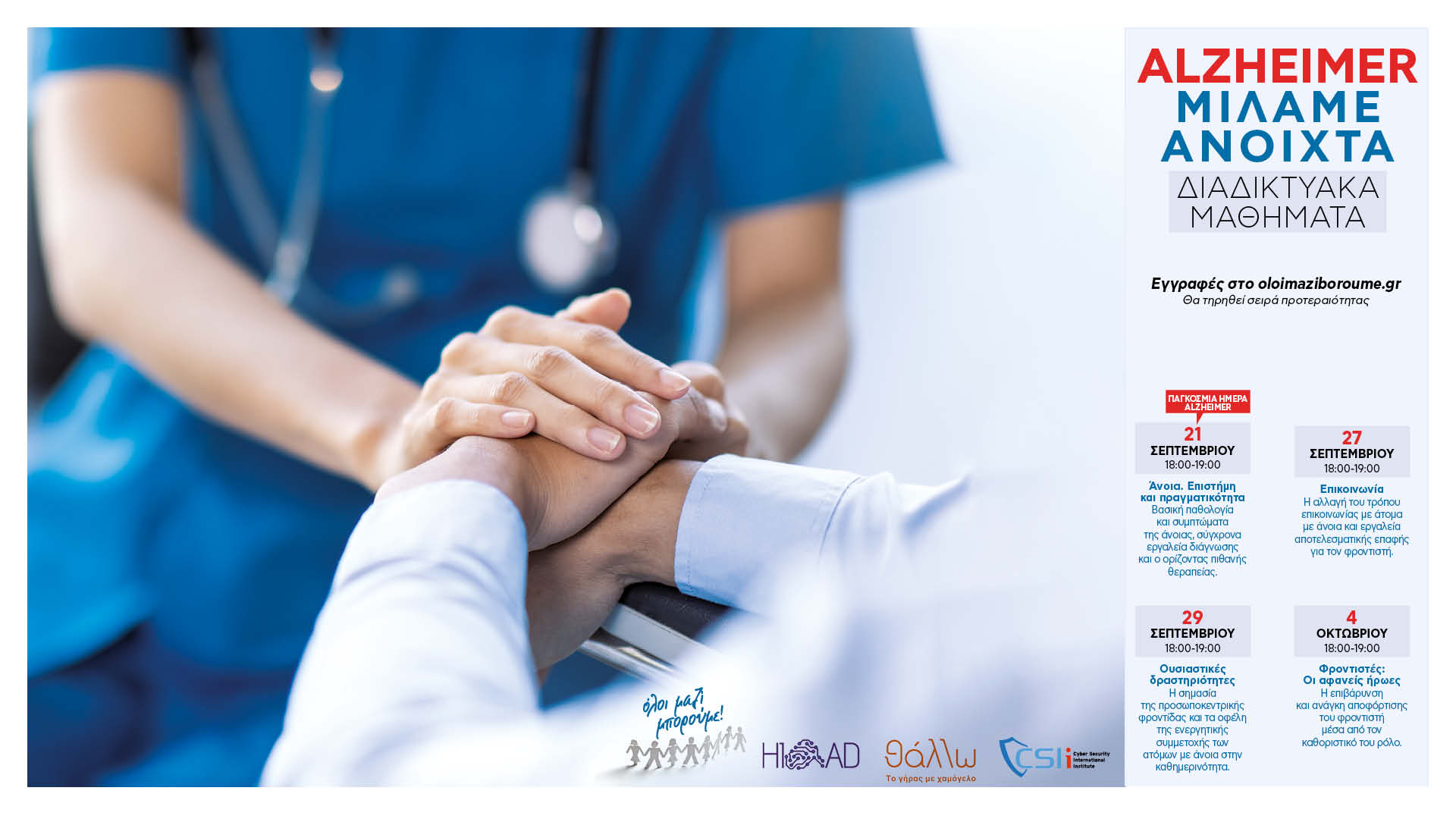 Το ΟΛΟΙ ΜΑΖΙ ΜΠΟΡΟΥΜΕ σε συνεργασία με την Ελληνική Πρωτοβουλία ενάντια στην Alzheimer (Hellenic Initiative against Alzheimer’s Disease), το Πρόγραμμα Θάλλω και το CSI Institute διοργανώνουν δωρεάν διαδικτυακά μαθήματα που αφορούν τη νόσο του Alzheimer.