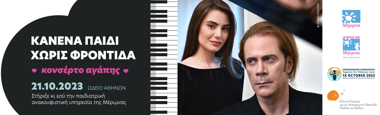 Με αφορμή την Παγκόσμια Ημέρα Ανακουφιστικής Φροντίδας, στις 14 Οκτωβρίου 2023, η αστική μη κερδοσκοπική εταιρεία Μέριμνα, που 28 χρόνια τώρα παρέχει φροντίδα και στήριξη σε παιδιά, εφήβους και οικογένειες που αντιμετωπίζουν μια σοβαρή ασθένεια ή την απώλεια αγαπημένου τους προσώπου, σε συνεργασία με το σωματείο Φίλοι της Μέριμνας και την Ελληνική Εταιρεία για την Ανακουφιστική Φροντίδα Παιδιών και Εφήβων, διοργανώνει το Σάββατο 21 Οκτωβρίου, ένα Κονσέρτο Αγάπης με τον Στέφανο Κορκολή στο Ωδείο Αθηνών.