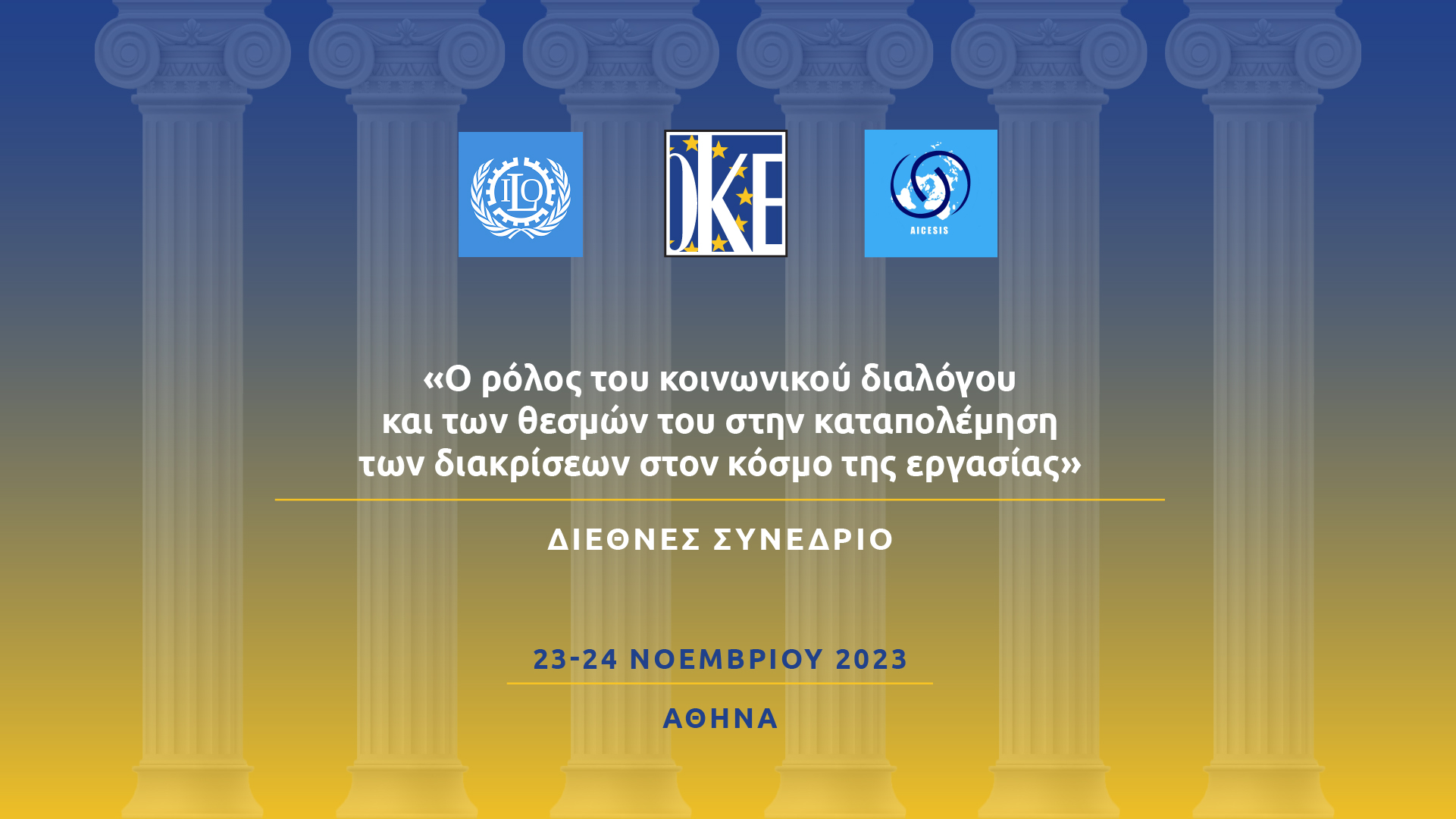 Η Διεθνής Οργάνωση Εργασίας (ΔΟΕ), η Διεθνής Ενωση Οικονομικών και Κοινωνικών Συμβουλίων και Παρόμοιων Θεσμών (AICESIS), σε συνεργασία με την Οικονομική και Κοινωνική Επιτροπή της Ελλάδος (Ο.Κ.Ε.), συνδιοργανώνουν Διεθνές Συνέδριο με θέμα: «Ο ρόλος του κοινωνικού διαλόγου και των θεσμών του στην καταπολέμηση των ανισοτήτων στον κόσμο της εργασίας», στις 23 και 24 Νοεμβρίου 2023, στην Αθήνα (Ξενοδοχείο «Grand Hyatt»).
