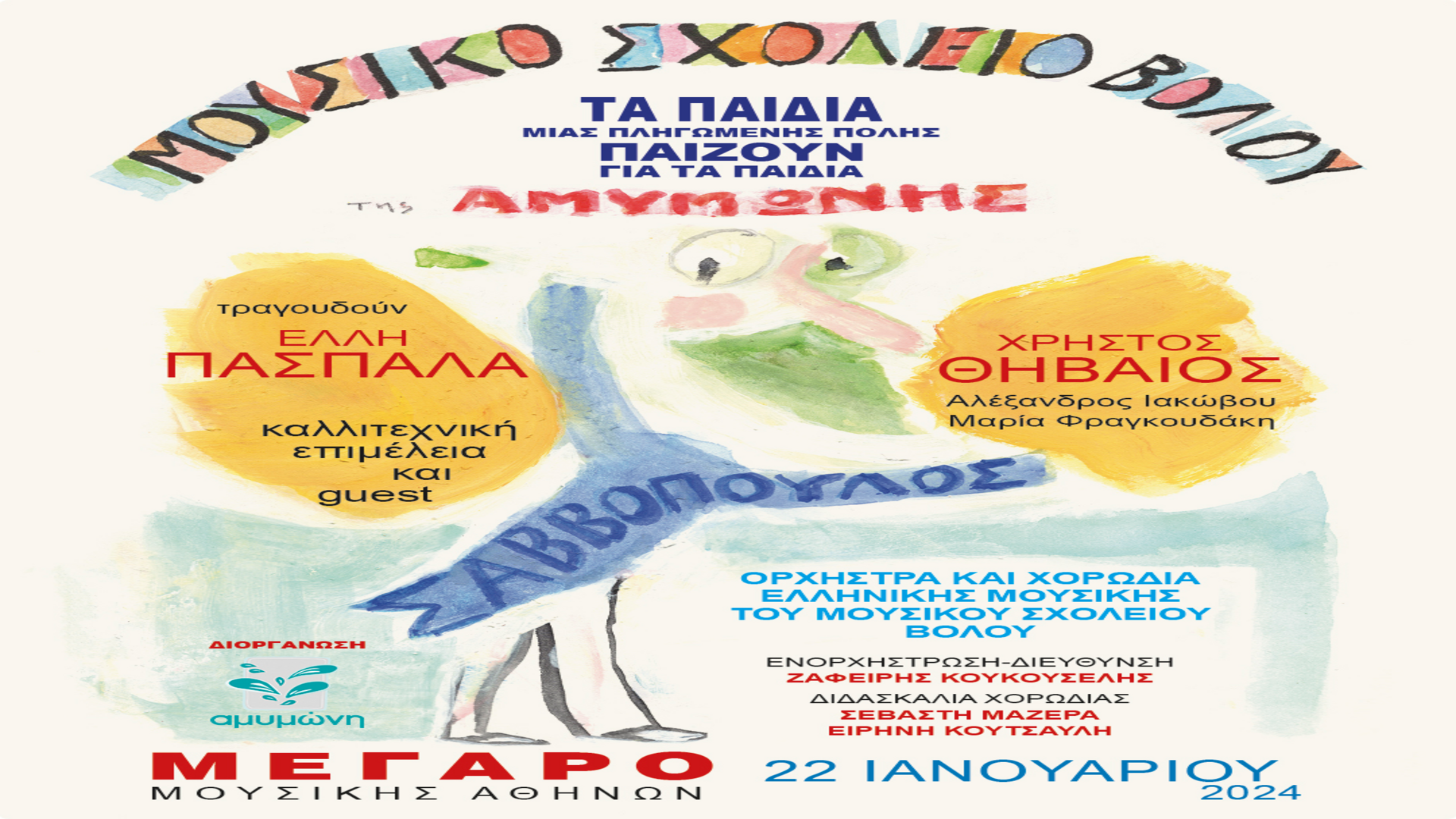 Η ορχήστρα και η χορωδία του Μουσικού Σχολείου Βόλου έρχονται καλεσμένοι από τον Διονύση Σαββόπουλο, για να συναντήσουν την Έλλη Πασπαλά και τον Χρήστο Θηβαίο, για μια μοναδική συναυλία στο Μέγαρο Μουσικής Αθηνών υπέρ των σκοπών της Αμυμώνης. Μία συναυλία αγκαλιά, που θα πραγματοποιηθεί τη Δευτέρα 22 Ιανουαρίου 2024.