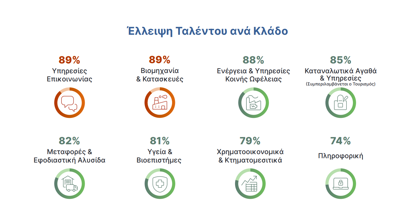 Οι κλάδοι στους οποίους αποτυπώνεται μεγαλύτερη έλλειψη ταλέντου στην Ελλάδα είναι οι Υπηρεσίες Επικοινωνίας και ο κλάδος της Βιομηχανίας & Κατασκευών με το 89% των εργοδοτών να αναφέρουν δυσκολία στην εύρεση ταλέντων.