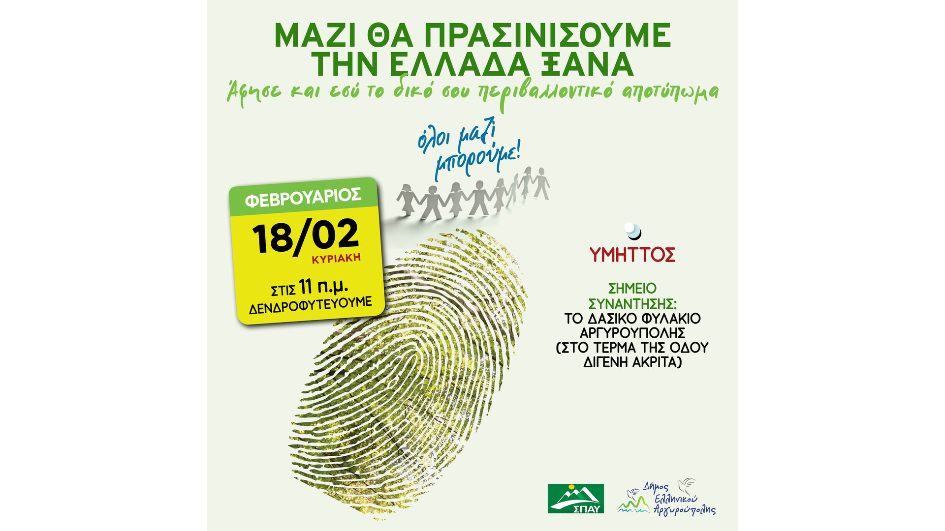 Tην Κυριακή 18 Φεβρουαρίου δενδροφυτεύουμε στον Υμηττό. Το σημείο συνάντησης είναι το Δασικό Φυλάκιο Αργυρούπολης, στο τέρμα της οδού Διγενή Ακρίτα, στις 11 το πρωί.