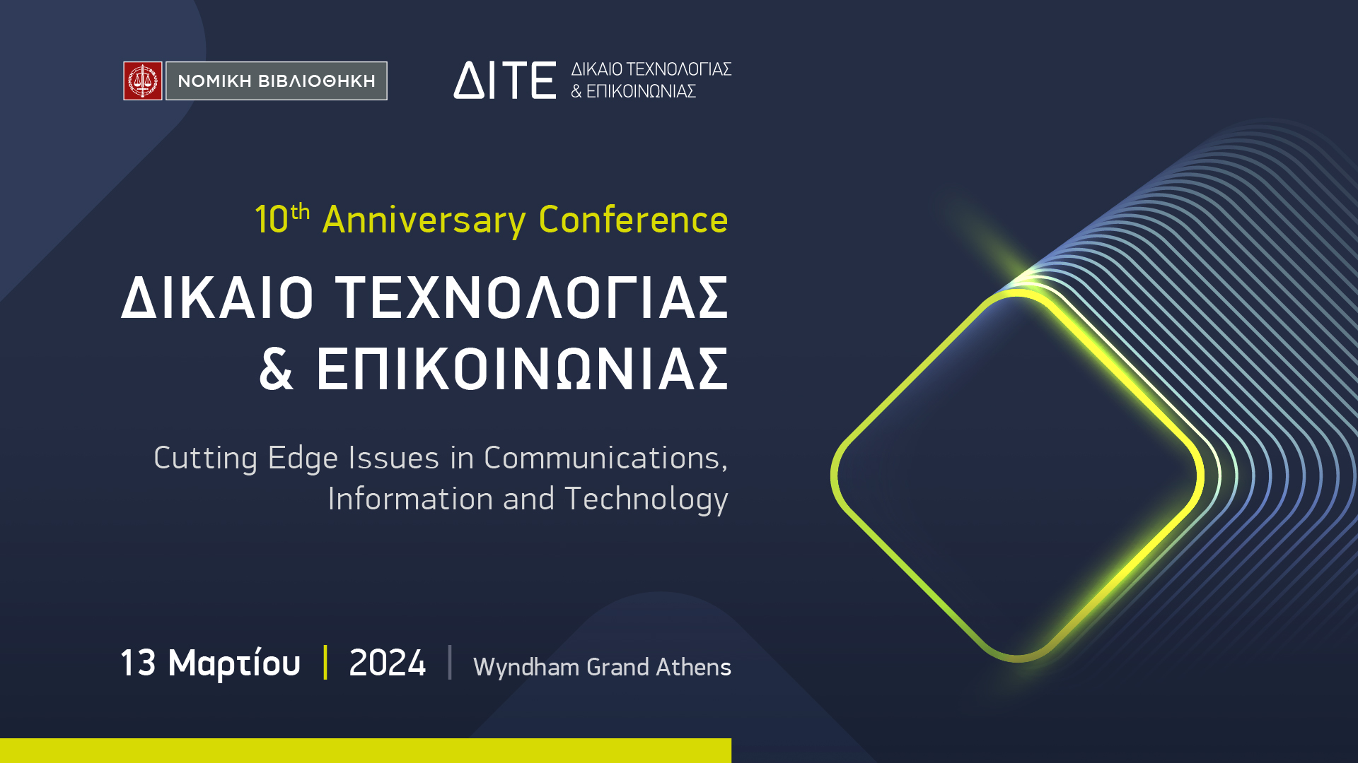 Η ΝΟΜΙΚΗ ΒΙΒΛΙΟΘΗΚΗ, σε συνεργασία με το επιστημονικό Περιοδικό “Δίκαιο Τεχνολογίας & Επικοινωνίας“, διοργανώνει το 10ο Συνέδριο για το ΔΙΚΑΙΟ ΤΕΧΝΟΛΟΓΙΑΣ & ΕΠΙΚΟΙΝΩΝΙΑΣ, “Cutting Edge Issues in Communications, Information and Technology” την Τετάρτη 13 Μαρτίου 2024, διά ζώσης στο Wyndham Grand Athens.