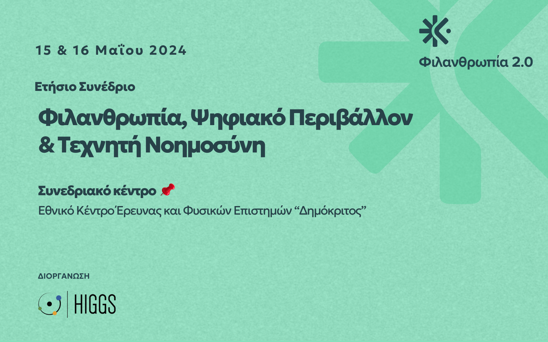 Το HIGGS, ο πρώτος και μεγαλύτερος κόμβος ενδυνάμωσης των οργανώσεων της Κοινωνίας των Πολιτών, διοργανώνει το συνέδριο Φιλανθρωπία 2.0 με θέμα «Φιλανθρωπία, Ψηφιακό Περιβάλλον και Τεχνητή Νοημοσύνη». Το συνέδριο θα πραγματοποιηθεί 15 & 16 Μαΐου 2024, στο Συνεδριακό κέντρο ΕΚΕΦΕ “Δημόκριτος” και θα εστιάσει στο πως οι τεχνολογικές εξελίξεις μεταμορφώνουν το τοπίο της προσφοράς.