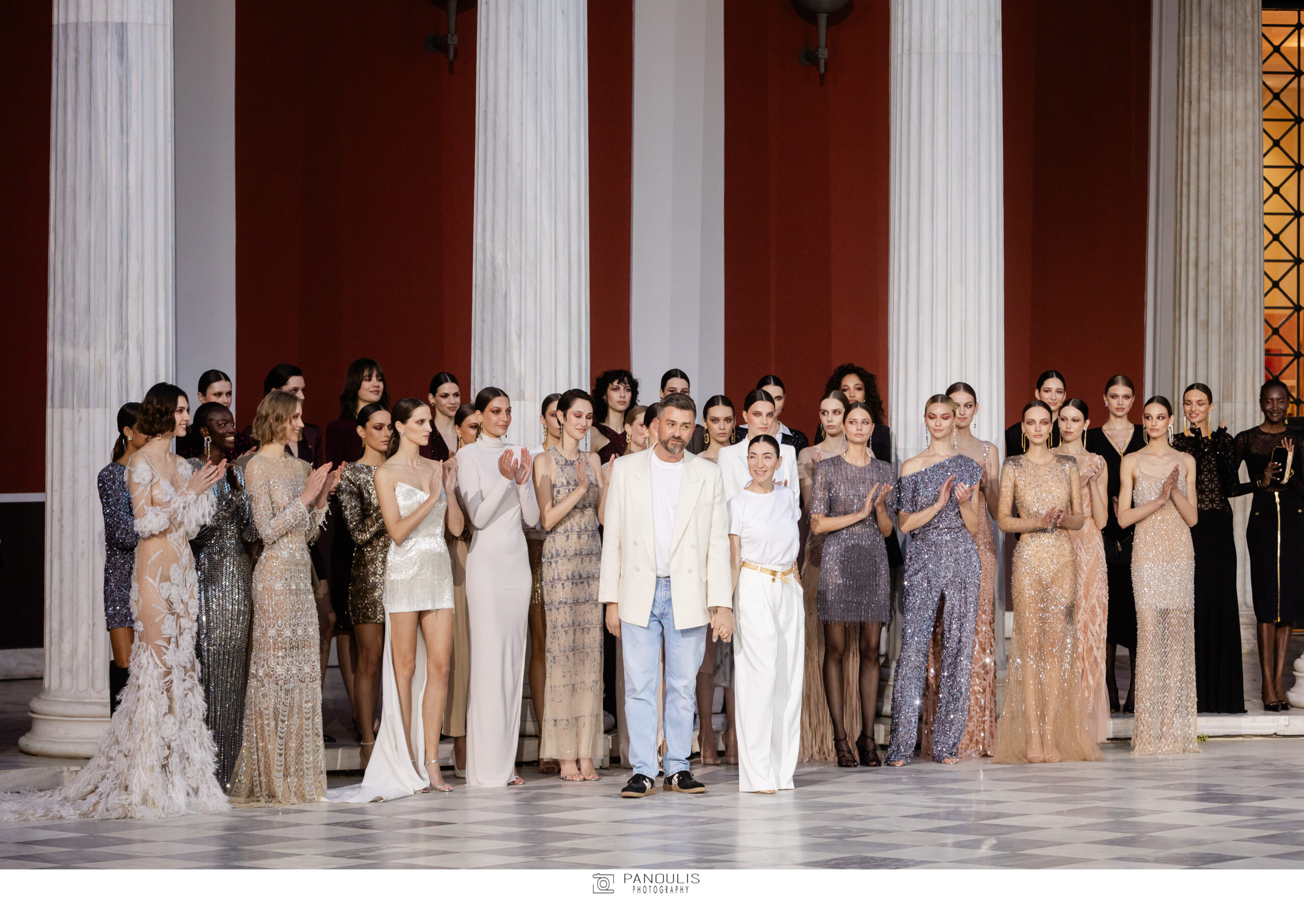 Οι γυναίκες της Elisabetta Franchi διέσχισαν το εμβληματικό περιστύλιο του νεοκλασσικού Μεγάρου του Ζαππείου, με το φως του ηλιοβασιλέματος, σαν φόρο τιμής στο δόγμα της κλασσικής ομορφιάς, όπως διαμορφώθηκε μέσα από τους αιώνες από τις Ελληνίδες Θεές και την αγαλματένια τους χάρη. Το όραμα της Elisabetta Franchi για τη μόδα, η τεχνογνωσία και η κατασκευαστική μαεστρία, πάντα υπηρετούσαν τη γυναικεία ομορφιά, ως απόδειξη της αγάπης της σχεδιάστριας για τον κόσμο των γυναικών.