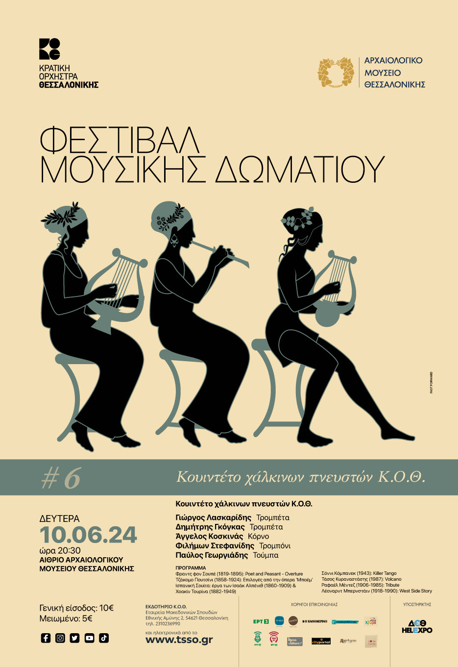 Το Φεστιβάλ Μουσικής Δωματίου που συνδιοργανώνουν η Κρατική Ορχήστρα Θεσσαλονίκης και το Αρχαιολογικό Μουσείο Θεσσαλονίκης, με την υποστήριξη του Υπουργείου Πολιτισμού, συνεχίζεται στο όμορφο Αίθριο του Αρχαιολογικού Μουσείου Θεσσαλονίκης με το Κουιντέτο Πνευστών της Κ.Ο.Θ., που παρουσιάζει ένα πλούσιο πρόγραμμα με έργα για χάλκινα πνευστά, συνθετών από τις δυο πλευρές του Ατλαντικού.