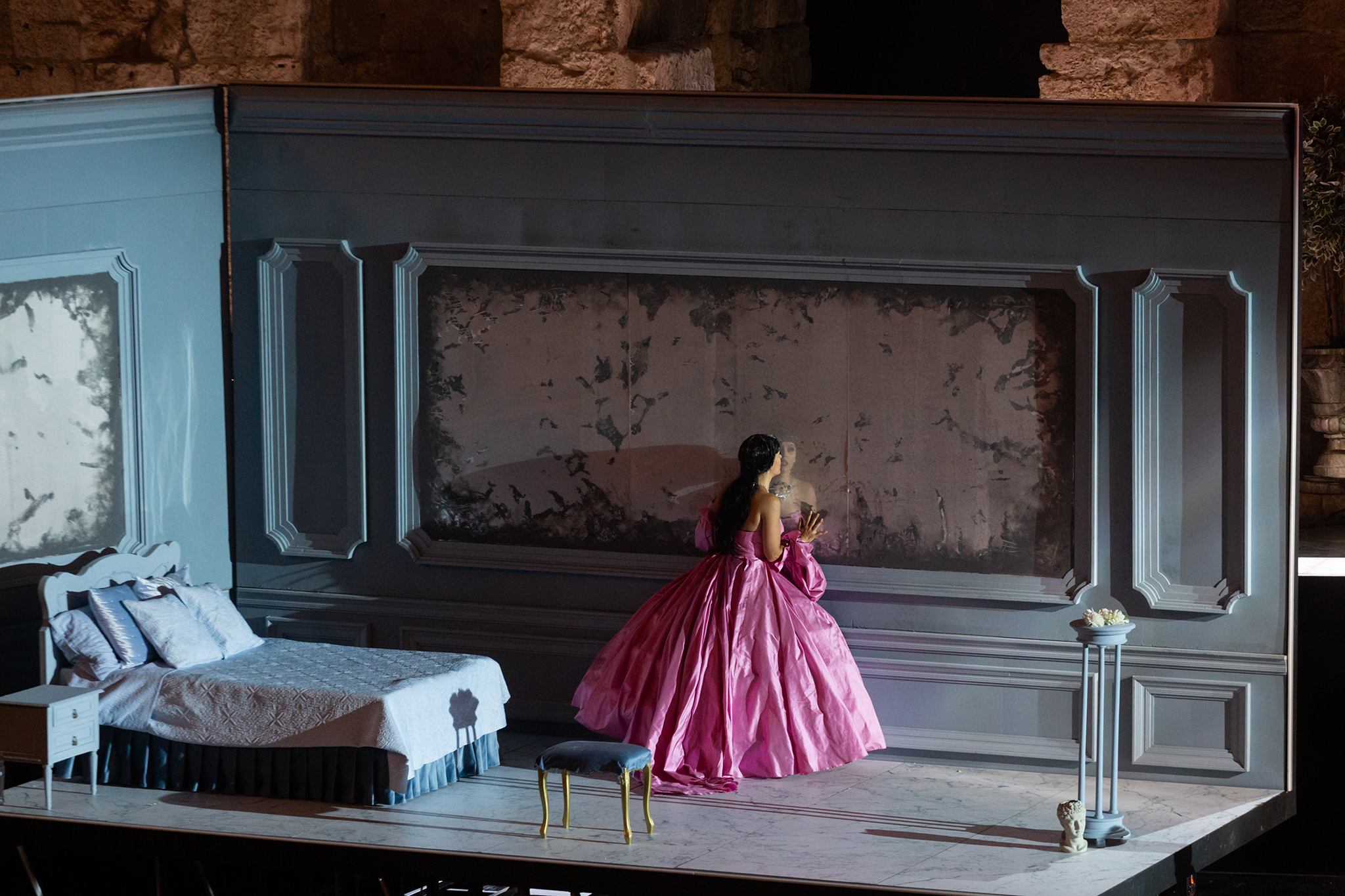Ο Κωνσταντίνος Ρήγος σημειώνει για την παραγωγή, η οποία πρωτοπαρουσιάστηκε στο ρωμαϊκό ωδείο το καλοκαίρι του 2019 με ξεχωριστή επιτυχία: «Η Τραβιάτα, παρουσιασμένη στον ιστορικό χώρο του Ηρωδείου, εντάσσεται σε μια απαιτητική όσο και ενδιαφέρουσα συνθήκη: πρέπει κανείς να βρει την ισορροπία μεταξύ των σκηνών της επιδεικτικής ευδαιμονίας και των στιγμών της ιδιωτικότητας. Οι τοίχοι του αρχαίου ωδείου είναι εγγυητές της διαχρονίας και εντάσσουν υποχρεωτικά την αφήγηση στον μεγάλο χρόνο. Στον ενδιάμεσο αυτό χώρο, μεταξύ παρελθόντος και μέλλοντος, η Βιολέττα μοιάζει σταματημένη σε μια εποχή μετέωρη, προσφέροντας στον θεατή την ιστορία της, προϊόν κι αυτή προς κατανάλωση, όπως ήταν και η ίδια. Ο χώρος του Ηρωδείου μοιράζεται ανάμεσα στα κλειστά δωμάτια (που αντιπροσωπεύουν το εσωτερικό ψυχικό τοπίο της ηρωίδας) και στον κόσμο / σκηνή της καταναγκαστικής ηδονής, όπου δεσπόζει ένα τεράστιο τραπέζι. Οι δύο κόσμοι εξελίσσονται παράλληλα, ενώ η ηρωίδα καθρεφτίζεται στο alter ego της, δίνοντας έτσι υπόσταση στην εσωτερική της διχοτομία, που αποτελεί ίσως και το πιο σημαντικό αφηγηματικό στοιχείο του έργου. Η Τραβιάτα είναι η Βιολέττα, γι’ αυτό και η εστίαση στην αποτύπωση των συναισθημάτων της μεγεθύνεται και προβάλλεται στον φθαρμένο από τον χρόνο τοίχο του Ηρωδείου».
