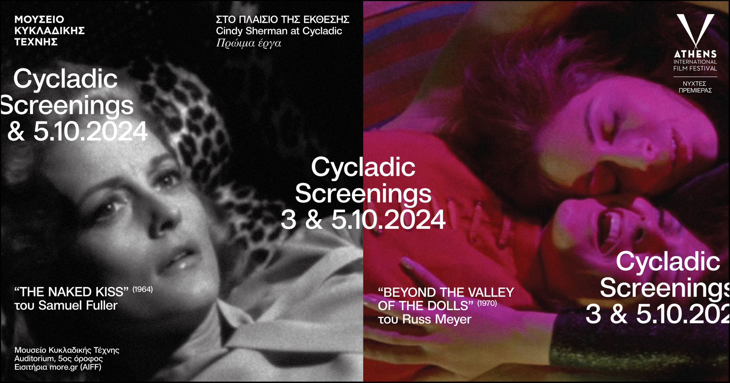 Στο πλαίσιο της έκθεσης Cindy Sherman at Cycladic: Πρώιμα έργα που ολοκληρώνεται στις 4 Νοεμβρίου, το Μουσείο Κυκλαδικής Τέχνης συνεργάζεται με το 30ό Διεθνές Φεστιβάλ Κινηματογράφου της Αθήνας Νύχτες Πρεμιέρας και διοργανώνει τα Cycladic Screenings στις 3 και 5 Οκτωβρίου 2024. Πρόκειται για την προβολή δύο κινηματογραφικών ταινιών που επέλεξε η ίδια η Cindy Sherman ως πηγή έμπνευσης για τη δημιουργία μιας σειράς φωτογραφικών της έργων, μεγάλο μέρος των οποίων παρουσιάζονται στο πλαίσιο της έκθεσής της στο Μουσείο Κυκλαδικής Τέχνης. Οι θεατές θα έχουν τη δυνατότητα να δουν την ίδια μέρα μία ή και τις δύο ταινίες και παράλληλα να περιηγηθούν στην έκθεση.