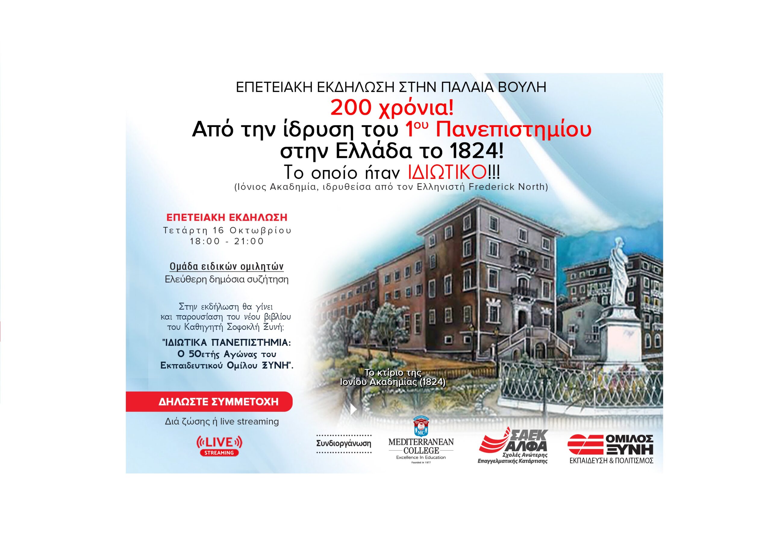 “200 χρόνια από την ίδρυση του πρώτου Πανεπιστημίου στη Νεότερη Ιστορία της Ελλάδας (1824), το οποίο ήταν ΙΔΙΩΤΙΚΟ”