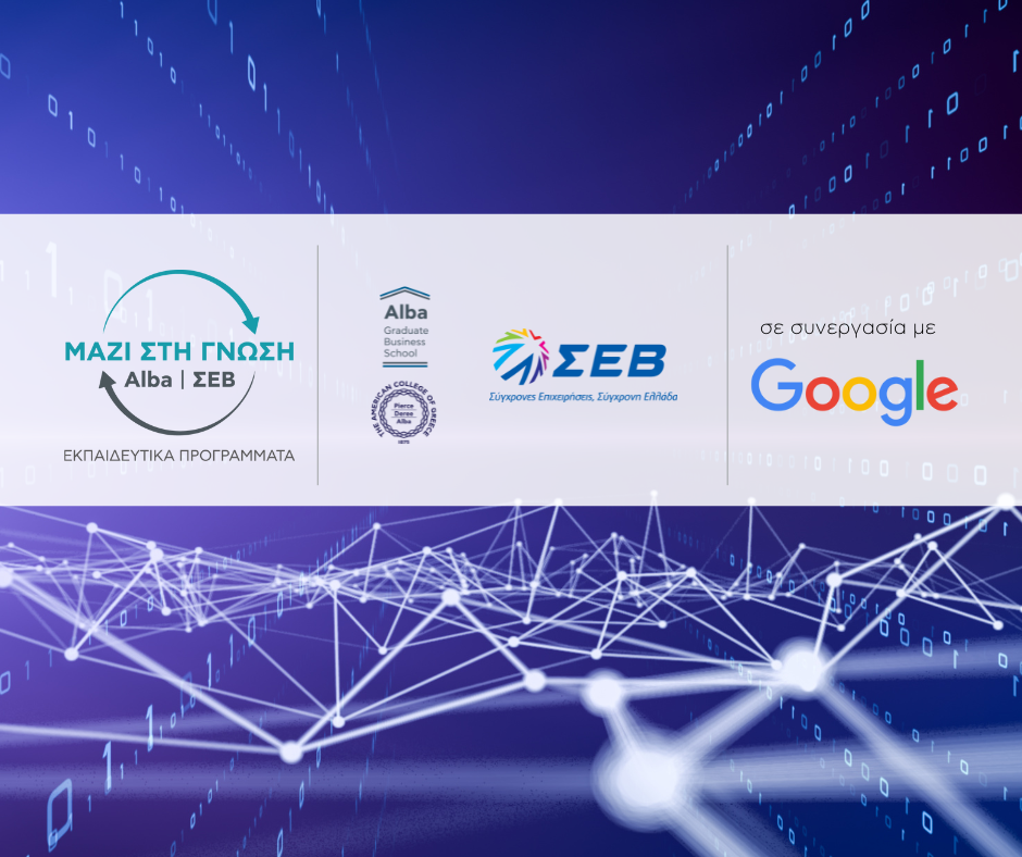Η τεχνογνωσία της Google συνδυάζεται με την εφαρμοσμένη θεωρητική γνώση που παρέχεται από το τμήμα Executive Development του Alba Graduate Business School και αναβαθμίζει τα εκπαιδευτικά σεμινάρια του «Μαζί στη Γνώση» που προσφέρονται δωρεάν, αποκλειστικά στα στελέχη των επιχειρήσεων-μελών του ΣΕΒ.
