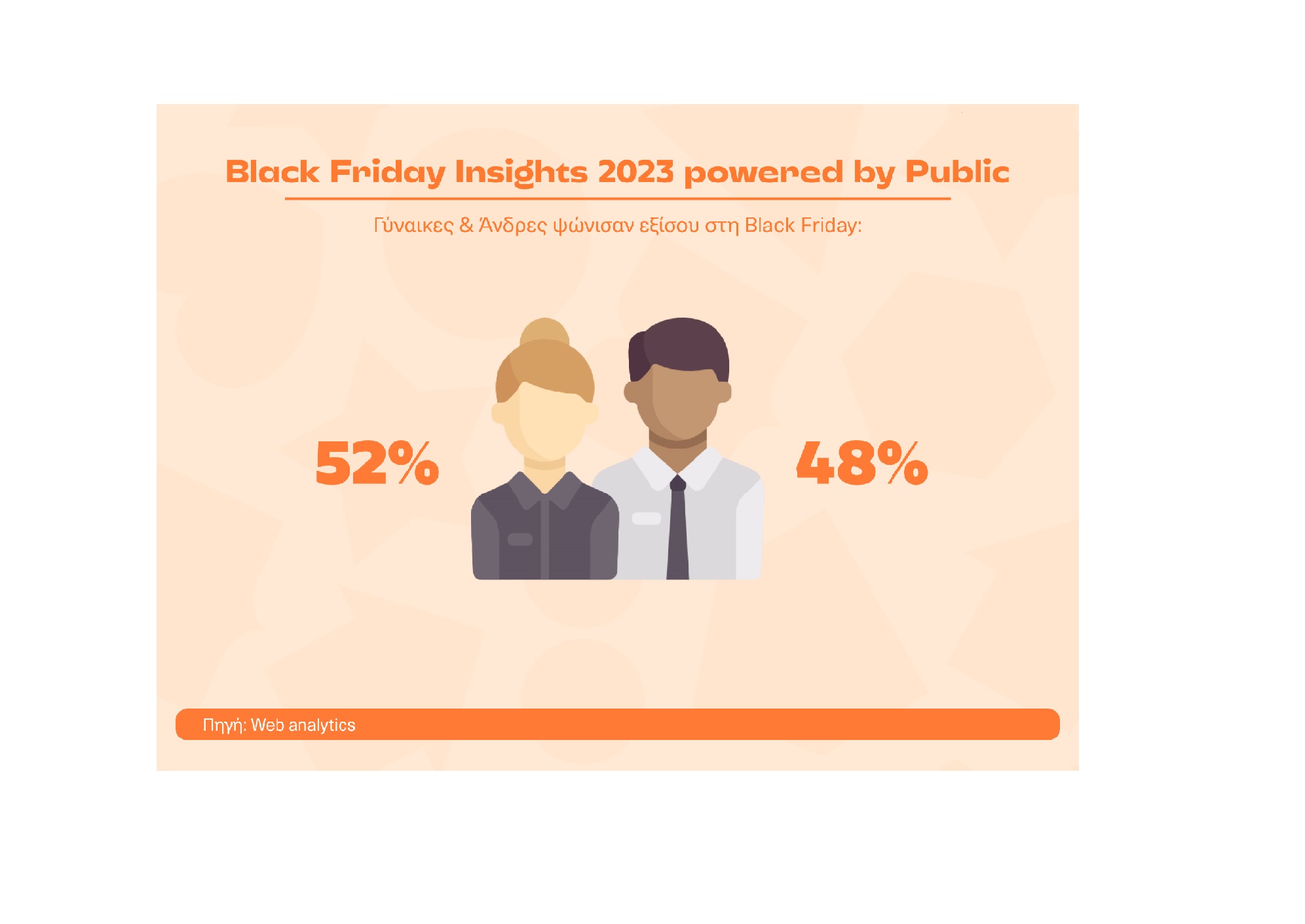- Και το 2023, γυναίκες και άνδρες ψώνισαν εξίσου στη Black Friday: Σταθερά και πέρσι, οι γυναίκες αποτέλεσαν το 52% του πληθυσμού που ψώνισε, ενώ το 48% ήταν άνδρες, διατηρώντας τα ποσοστά στο ίδιο επίπεδο με το 2022.