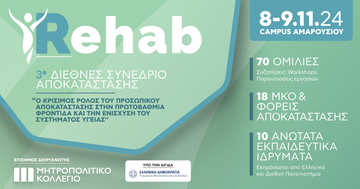 Με το Μητροπολιτικό Κολλέγιο, το μεγαλύτερο Κολλέγιο Πανεπιστημιακών Σπουδών στην Ελλάδα, να φιλοξενεί για τρίτη συνεχόμενη χρονιά το Διεθνές Διεπιστημονικό Συνέδριο Αποκατάστασης, στις 8-9 Νοεμβρίου 2024 στο Campus του στο Μαρούσι, ανοίγει ο διάλογος για τα κρίσιμα ζητήματα που αφορούν στην αποκατάσταση και τη βελτίωση των υπηρεσιών υγείας.