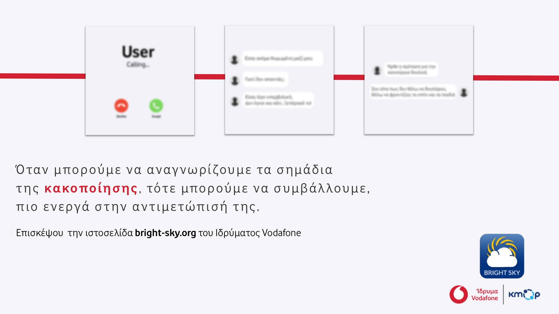 Με αφορμή τη Διεθνή Ημέρα για την Εξάλειψη της Βίας κατά των Γυναικών, το Ίδρυμα Vodafone, πιστό στη δέσμευσή του να επιστρατεύει τη δύναμη της τεχνολογίας για το κοινό καλό, ενθαρρύνει όλους και όλες να επισκεφθούν την ιστοσελίδα και την εφαρμογή Bright Sky. Το Bright Sky, με περισσότερους από 1 εκατομμύριο χρήστες παγκοσμίως, αποτελεί ένα πολύτιμο εργαλείο στην αντιμετώπιση της έμφυλης και ενδοοικογενειακής βίας, που παρέχει συμβουλευτική υποστήριξη, αλλά και καθοδήγηση για την αντιμετώπιση περιστατικών κακοποιητικής συμπεριφοράς,