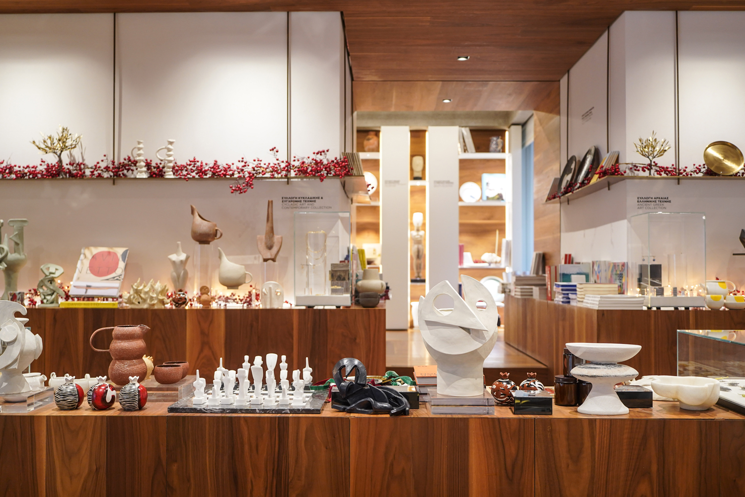 Στο Cycladic Shop αλλά και στο eShop θα βρείτε επίσης μεγάλη γκάμα από στολίδια με κυκλαδικές μορφές και λεπτομέρειες αγγείων της αρχαίας ελληνικής τέχνης, χριστουγεννιάτικα αρωματικά κεριά, ξεχωριστά διακοσμητικά αντικείμενα για το σπίτι και το γραφείο, παιχνίδια και βιβλία για μικρούς και μεγάλους.