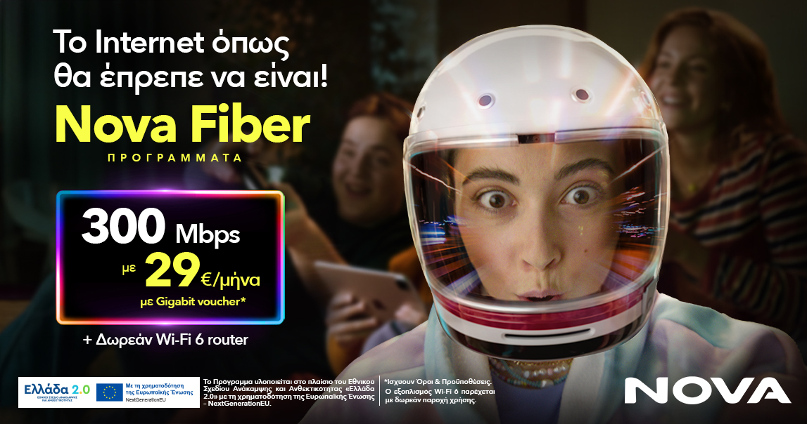 Με υπερ-υψηλές ταχύτητες έως και 1 Gbps, η Nova επεκτείνει το Ίντερνετ υψηλής ταχύτητας σε σχεδόν δύο εκατομμύρια νοικοκυριά και επιχειρήσεις σε όλη την Ελλάδα, που θα μεταβούν από την τεχνολογία του χαλκού σε αυτή της οπτικής ίνας.