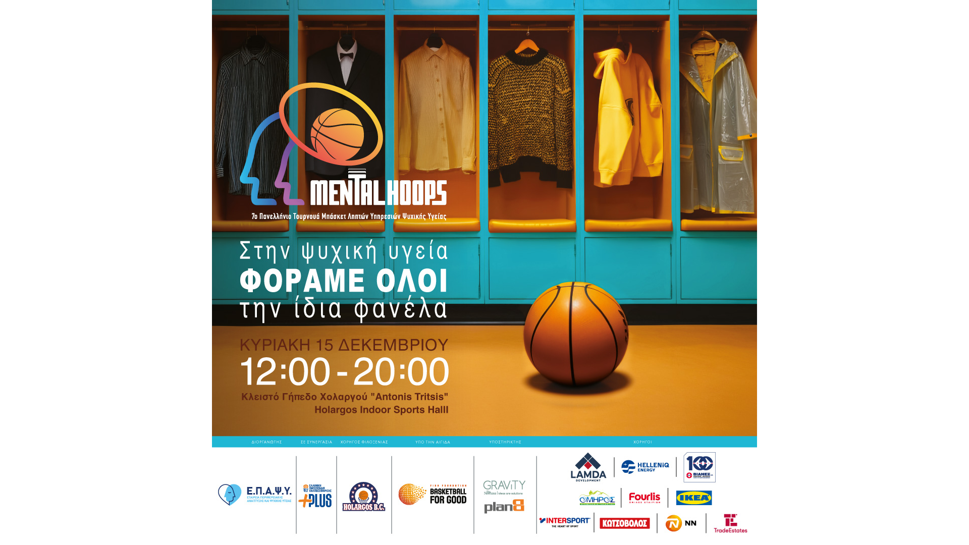 Η Εταιρεία Περιφερειακής Ανάπτυξης και Ψυχικής Υγείας (ΕΠΑΨΥ) διοργανώνει το 7ο Πανελλήνιο Τουρνουά Μπάσκετ “Mental Hoops“, την Κυριακή 15 Δεκεμβρίου 2024 και ώρα 12:00-20:00, στο Κλειστό Γυμναστήριο Χολαργού.