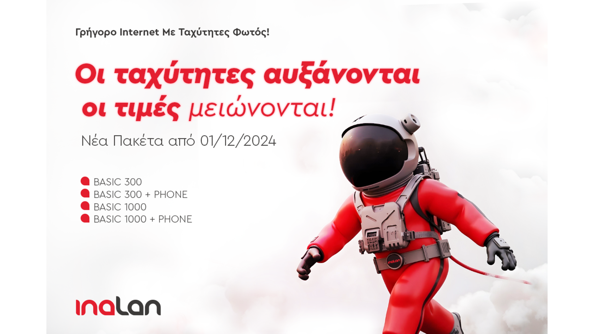Παράλληλα, η INALAN μειώνει το κόστος στα πακέτα BASIC 1000, προκειμένου να καταστήσουν ακόμη πιο προσιτή σε κάθε νοικοκυριό την ταχύτητα του μέλλοντος!