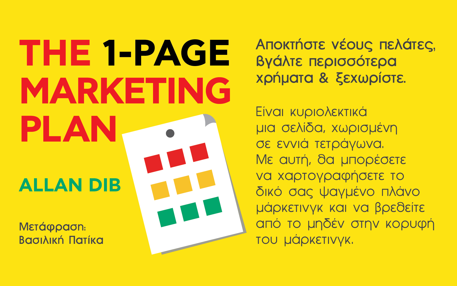 Στο The 1-Page Marketing Plan, o Allan Dib, κατά συρροή επιχειρηματίας και δεινό, επαναστατικό, επιχειρηματικό μυαλό, αποκαλύπτει ένα επίτευγμα στην εφαρμογή μάρκετινγκ που καθιστά τη δημιουργία ενός πλάνου μάρκετινγκ απλή και γρήγορη. Είναι κυριολεκτικά μια σελίδα, χωρισμένη σε εννιά τετράγωνα. Με αυτή, θα μπορέσετε να χαρτογραφήσετε το δικό σας ψαγμένο πλάνο μάρκετινγκ και να βρεθείτε από το μηδέν στην κορυφή του μάρκετινγκ.
