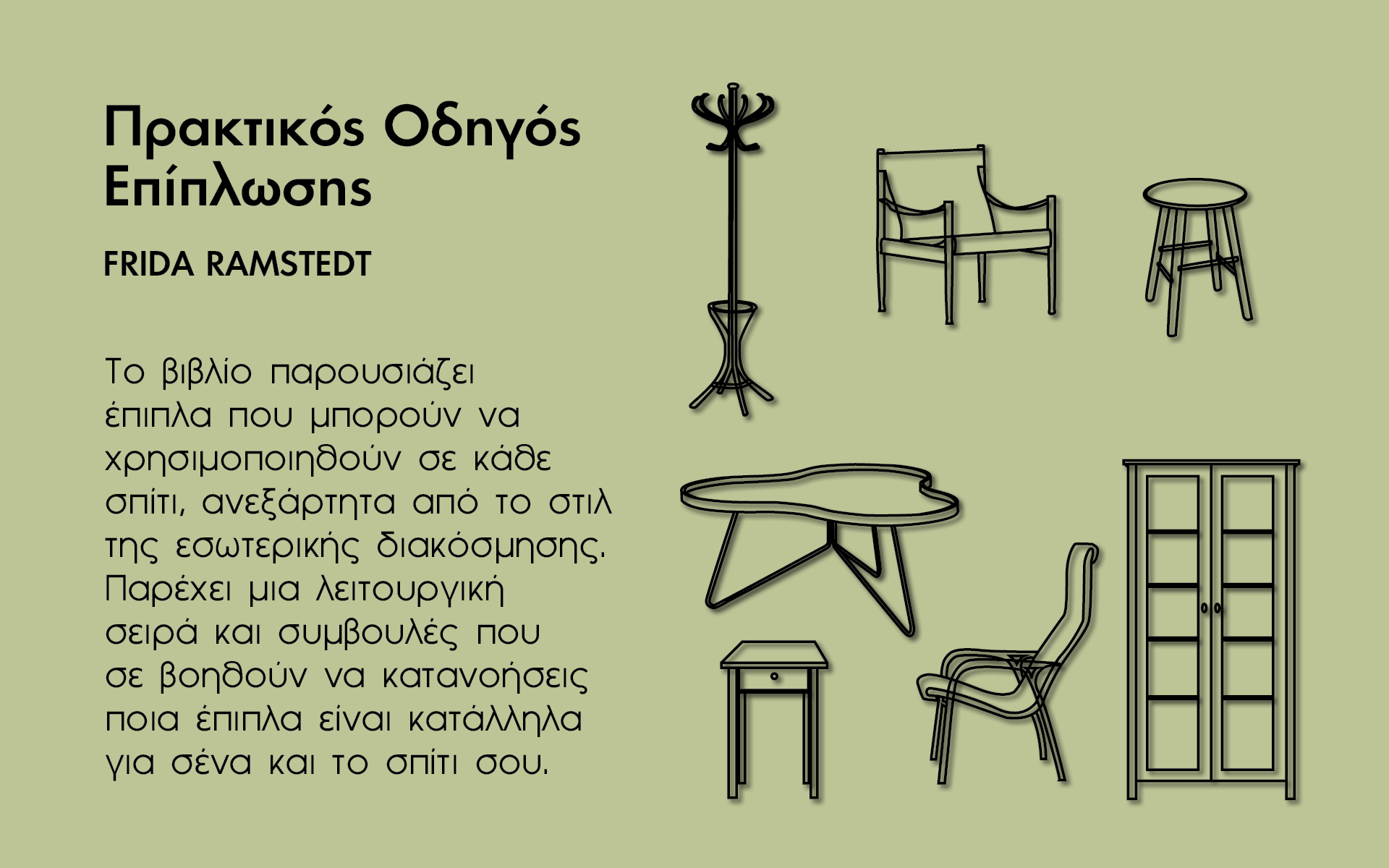Το Πρακτικός Οδηγός Επίπλωσης είναι η αυτοτελής συνέχεια και το τέλειο συμπλήρωμα του διεθνούς μπεστσέλερ της Frida Ramstedt Πρακτικός Οδηγός Εσωτερικής Διακόσμησης, το οποίο έχει μεταφραστεί σε 29 γλώσσες.