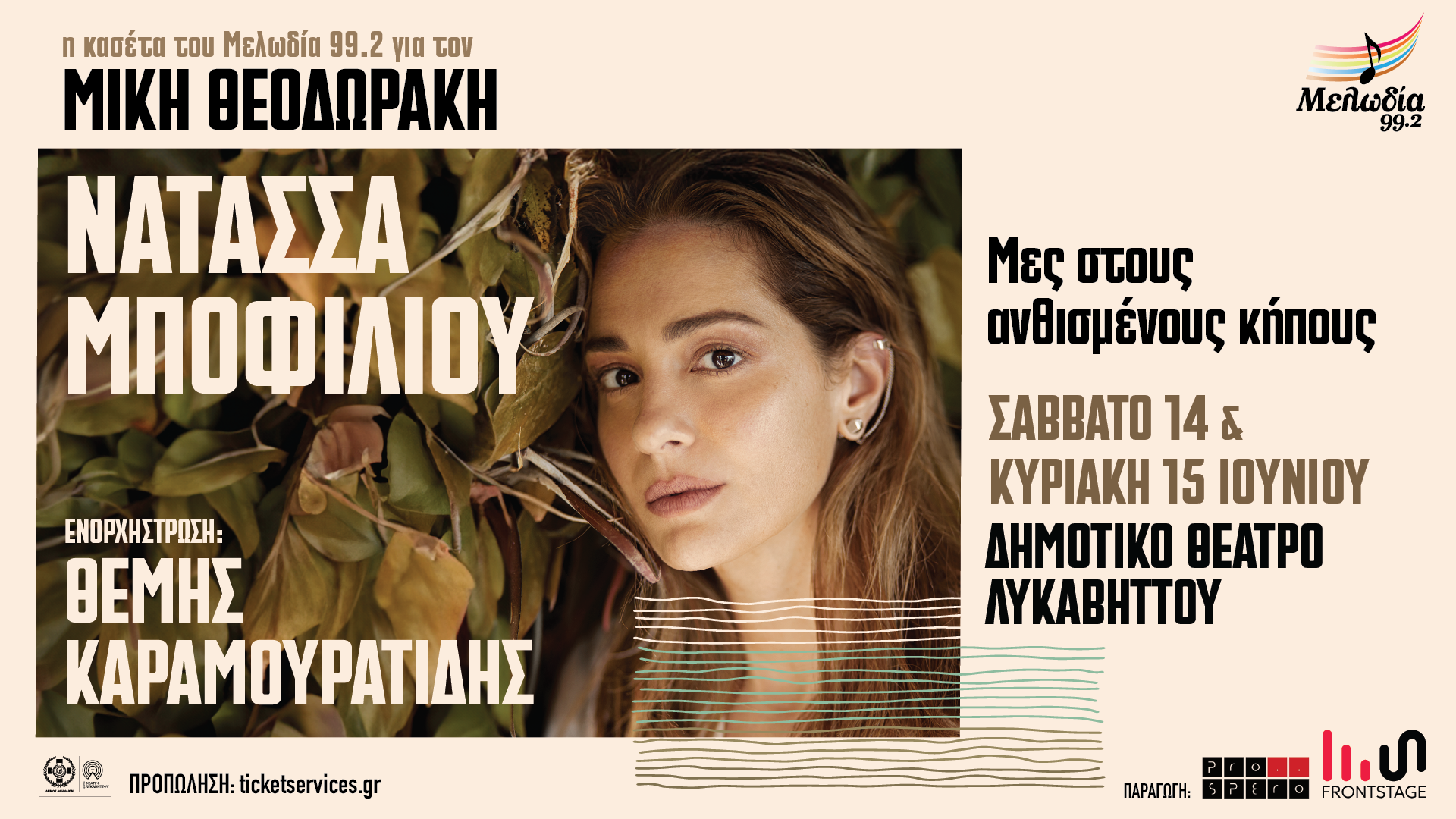 100 χρόνια συμπληρώνονται φέτος από τη γέννηση του σπουδαίου συνθέτη και εμβληματικού δημιουργού Μίκη Θεοδωράκη και ο Μελωδία 99.2 μαζί με την Νατάσσα Μποφίλιου σε ενορχηστρώσεις Θέμη Καραμουρατίδη, παρουσιάζουν ξανά σε Αθήνα και για πρώτη φορά στη Θεσσαλονίκη το αφιέρωμα «Μες στους ανθισμένους κήπους»: Το πιο συγκινητικό αφιέρωμα που έγινε για τον Μίκη Θεοδωράκη σε σύλληψη και καλλιτεχνική διεύθυνση της Νατάσσας Μποφίλιου.