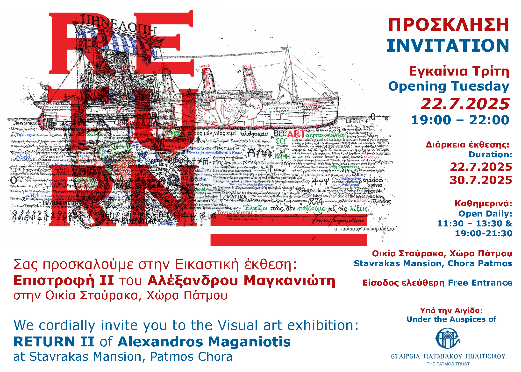 Από τις 22 έως τις 30 Ιουλίου 2025, η Εταιρία Πατμιακού Πολιτισμού φιλοξενεί υπό την αιγίδα της στην Οικία Σταύρακα στην Πάτμο την εικαστική έκθεση του Αλέξανδρου Μαγκανιώτη με τίτλο: Return ΙΙ και περιλαμβάνει έργα από την ενότητα Αναζητώντας τον Οδυσσέα.
