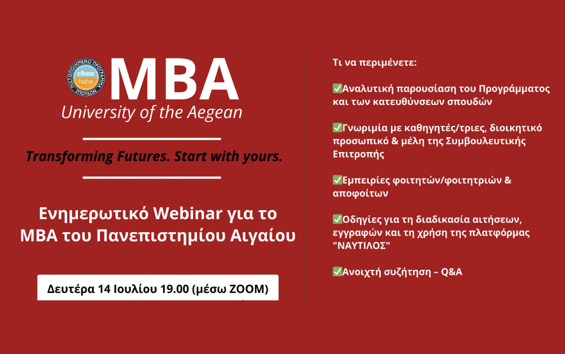 Το Μεταπτυχιακό Πρόγραμμα στη Διοίκηση Επιχειρήσεων (MBA) του Πανεπιστημίου Αιγαίου σας προσκαλεί σε ανοιχτό ενημερωτικό webinar τη Δευτέρα 14 Ιουλίου 2025, στις 19:00, μέσω Zoom.