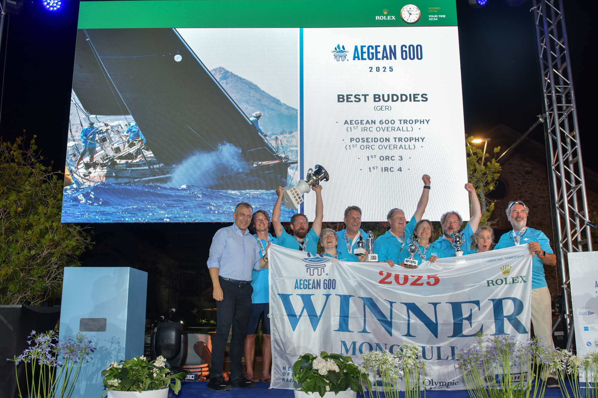 Σε γερμανικά χέρια, όπως και πέρσι, παρέμεινε το κύπελλο του Aegean 600. Το σκάφος Best Buddies από την Γερμανία με κυβερνήτη τον Kay Johannes Wrede πανηγύρισε την κατάκτηση του βαρύτιμου επαμειβόμενου κυπέλλου στη λαμπερή τελετή απονομής επάθλων που φιλοξενήθηκε το βράδυ του Σαββάτου στο Τεχνολογικό Πάρκο Λαυρίου. «Δεν είχε περάσει καν από το μυαλό μας ότι θα ερχόταν η ώρα που θα κερδίζαμε το AEGEAN 600 αλλά η προσπάθειά μας ανταμείφθηκε. Ήταν ένας σκληρός αγώνας με πολλές εναλλαγές στον άνεμο που δυσκόλεψε όλα τα πληρώματα. Ήταν κάτι το ανεπανάληπτο για εμάς να ταξιδεύουμε στο Αιγαίο και ανυπομονούμε να το ξαναζήσουμε το ερχόμενο καλοκαίρι» έλεγε περιχαρής ο κυβερνήτης του Best Buddies, Kay Johannes Wrede κρατώντας στην αγκαλιά του το κύπελλο του αγώνα, το οποίο είναι ακριβές αντίγραφο ενός κρατήρα αττικού εργαστηρίου του 5ου αιώνα Π.Χ.