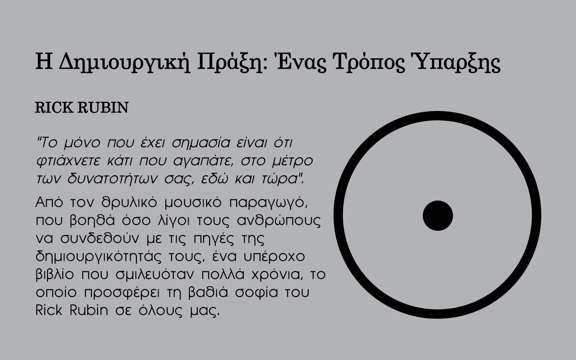 Από τον θρυλικό μουσικό παραγωγό, που βοηθά όσο λίγοι τους ανθρώπους να συνδεθούν με τις πηγές της δημιουργικότητάς τους, ένα υπέροχο βιβλίο που σμιλευόταν πολλά χρόνια, το οποίο προσφέρει τη βαθιά σοφία του Rick Rubin σε όλους μας.